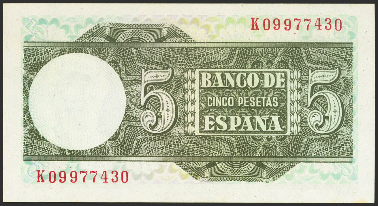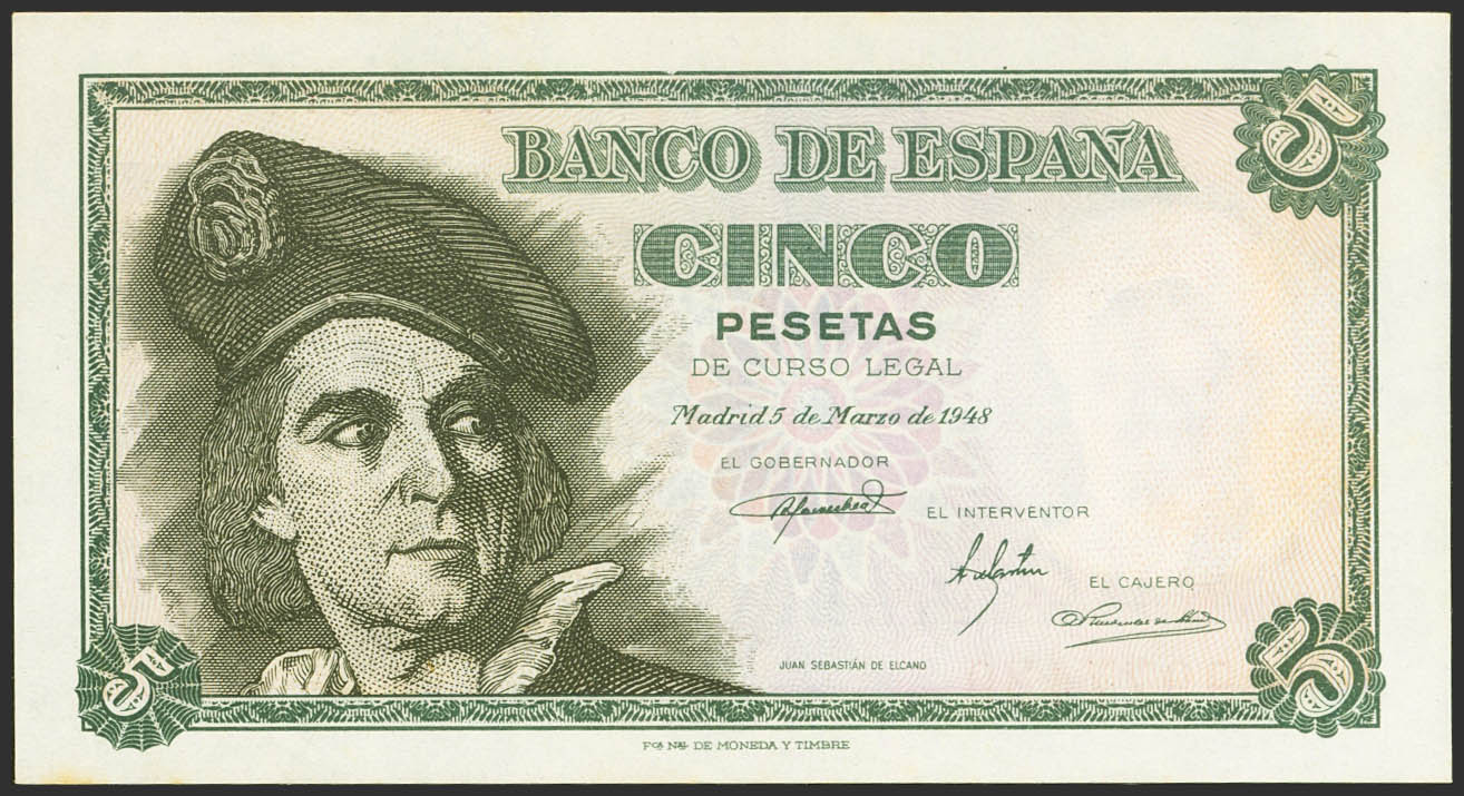 5 Pesetas. March 15, 1948. Series K. (Edifil 2021: 455a). Original sizing. Almost Uncirculated.