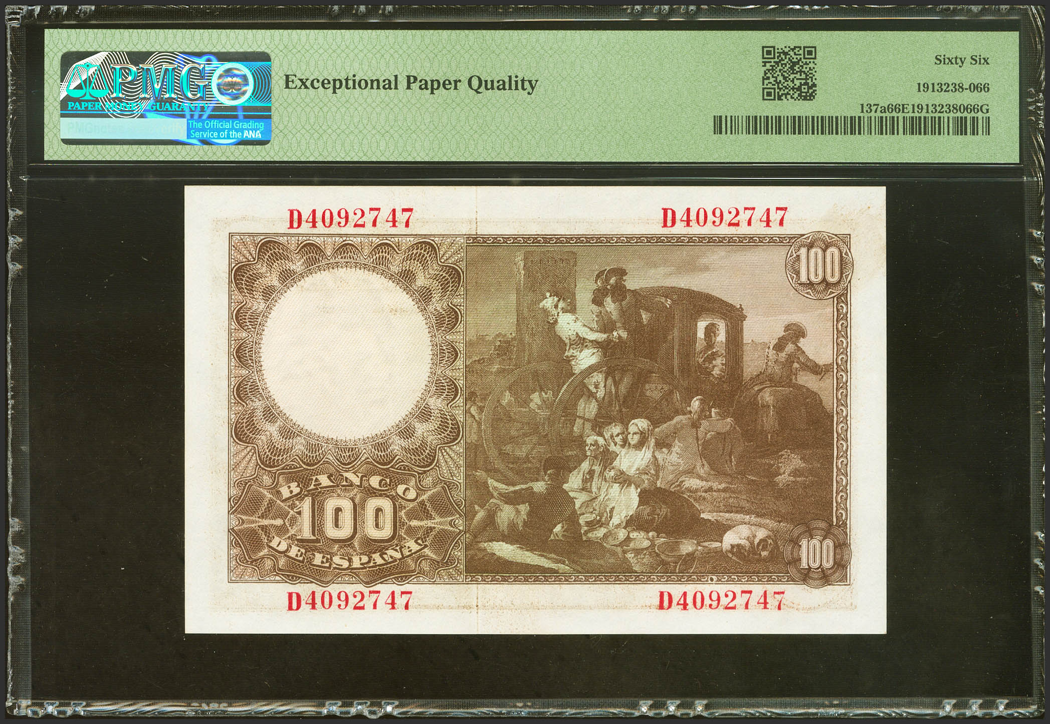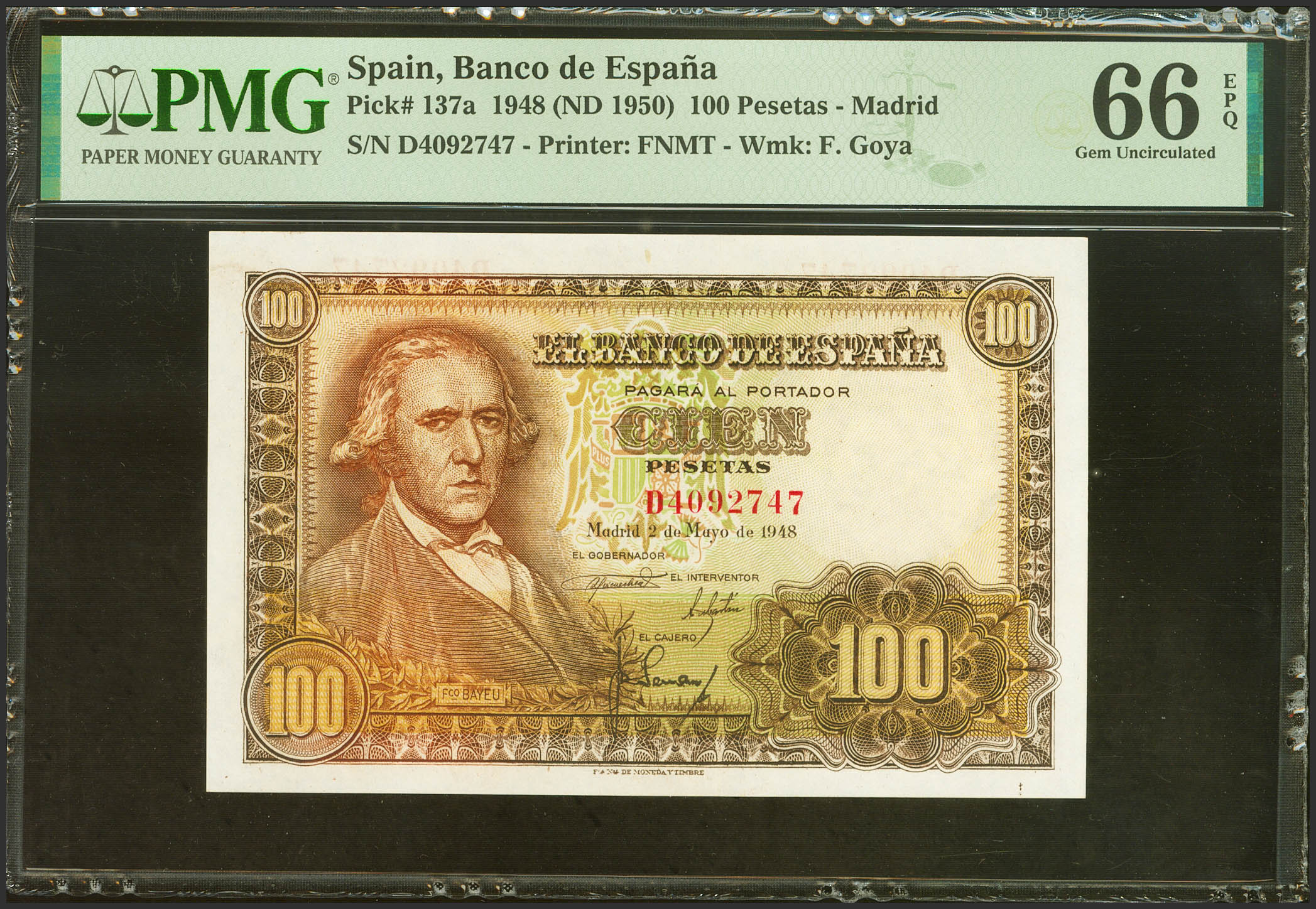 100 Pesetas. May 2, 1948. Series D. (Edifil 2023: 456a, Pick: 137a). Unusual in this exceptional quality, original sizing. Uncirculated. PMG66EPQ package.