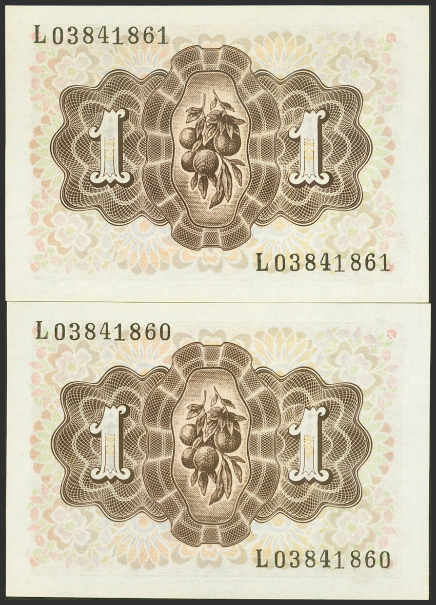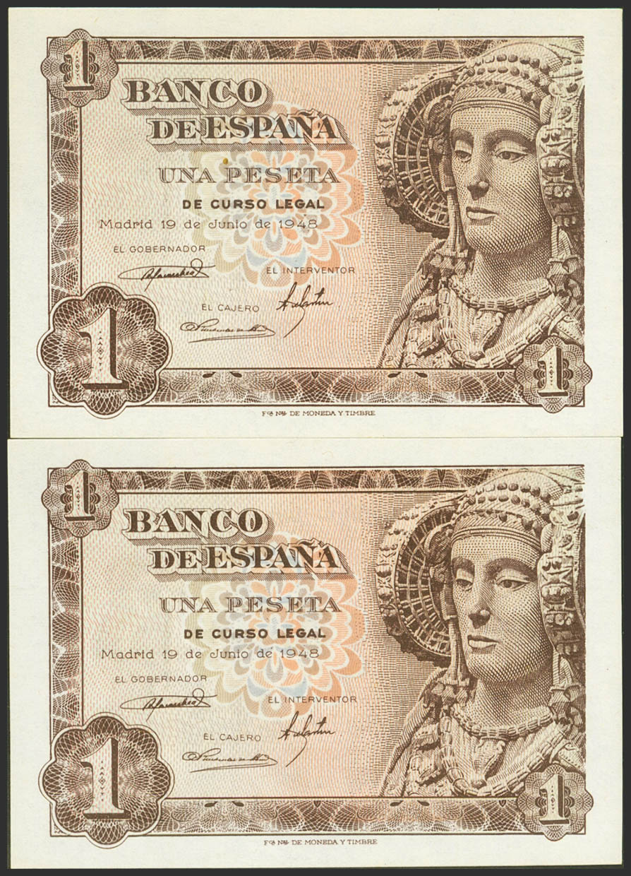 1 Peseta. June 19, 1948. Correlative couple. Series L. (Edifil 2023: 457a). Original sizing. Uncirculated.