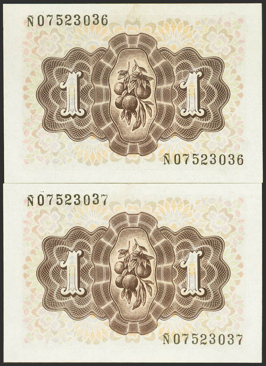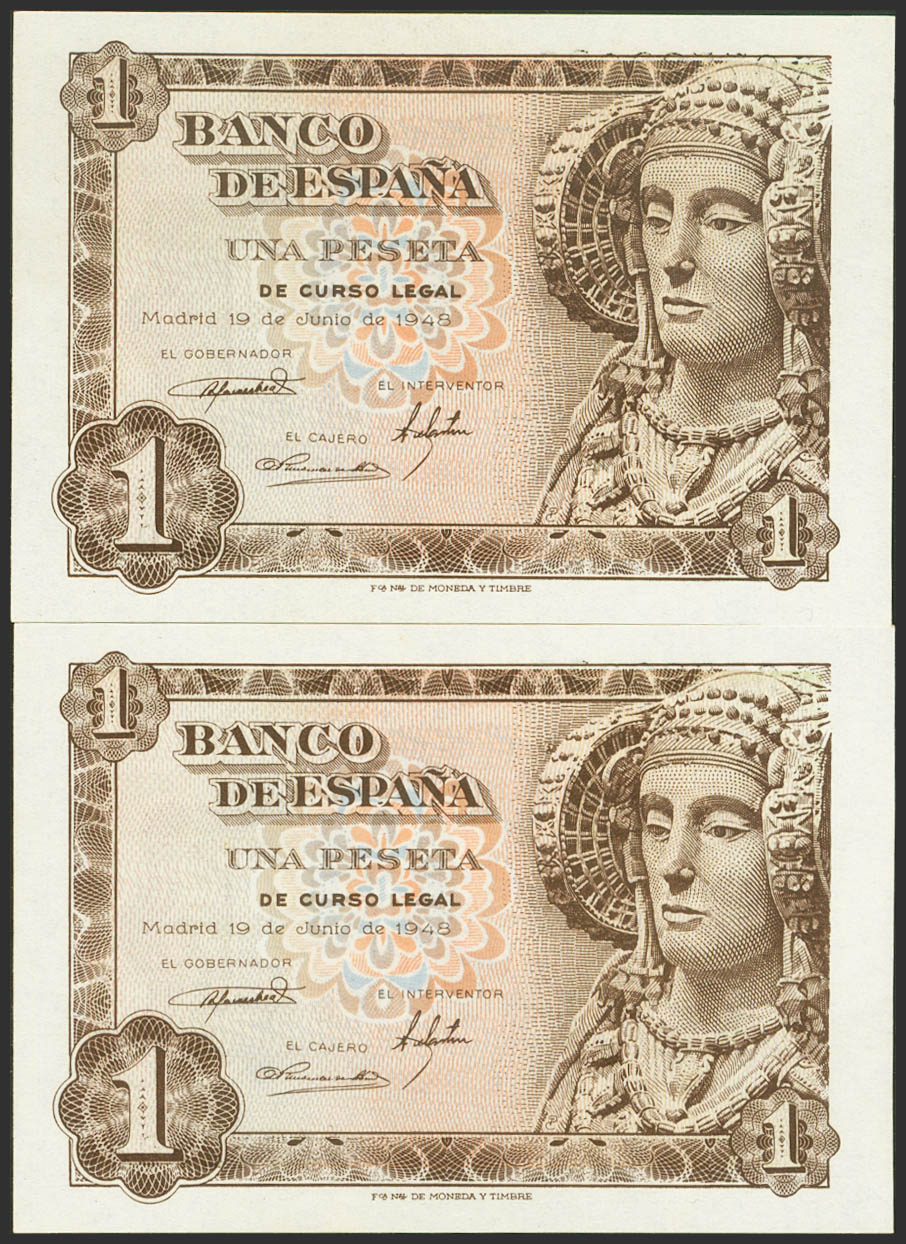 1 Peseta. June 19, 1948. Correlative couple. They laugh. (Edifil 2023: 457a). Original sizing. Uncirculated.