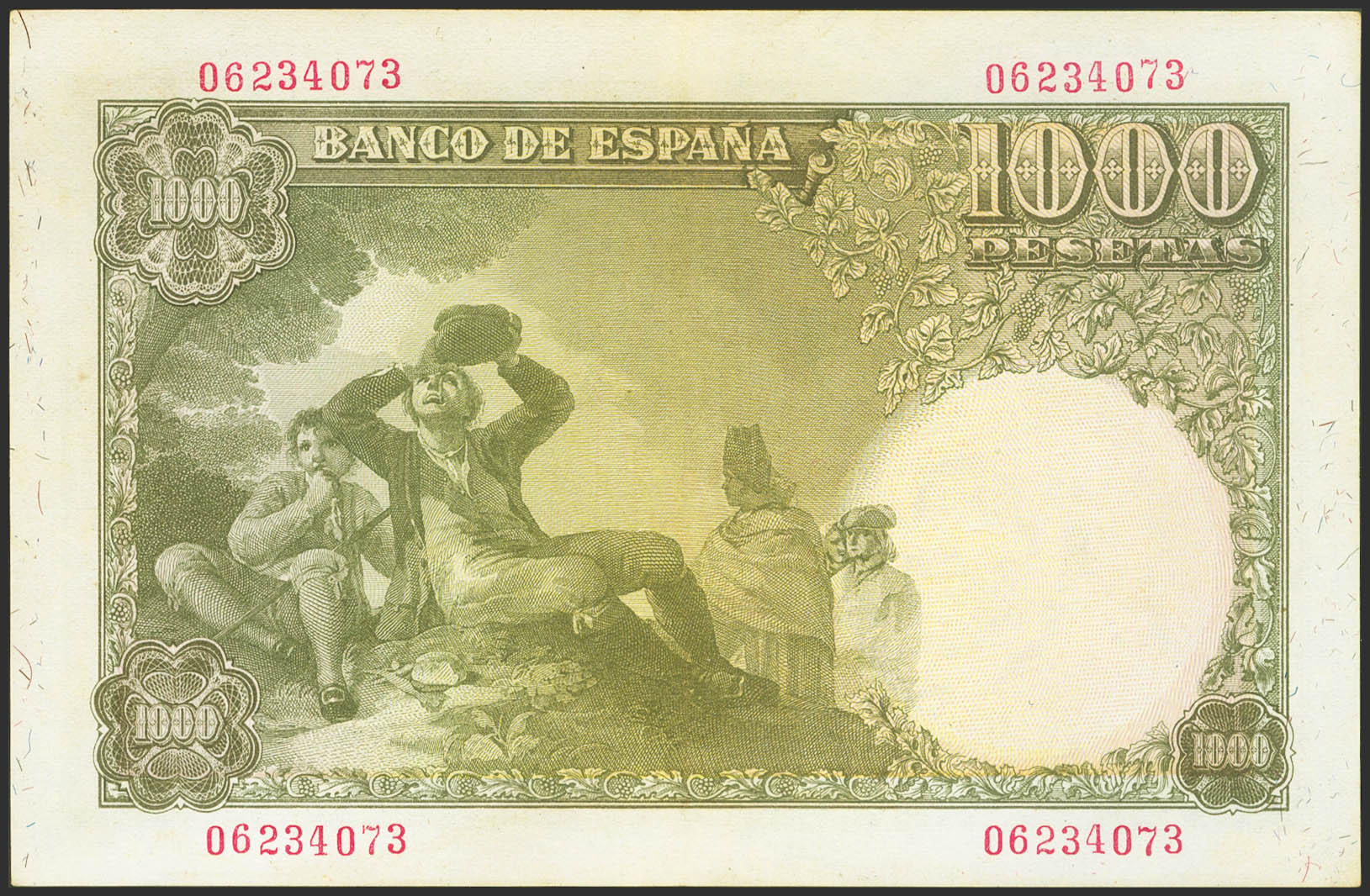 1000 Pesetas. November 4, 1949. No series. (Edifil 2021: 458). Unusual in this quality, it retains much of the original sizing. Good Extremely Fine.