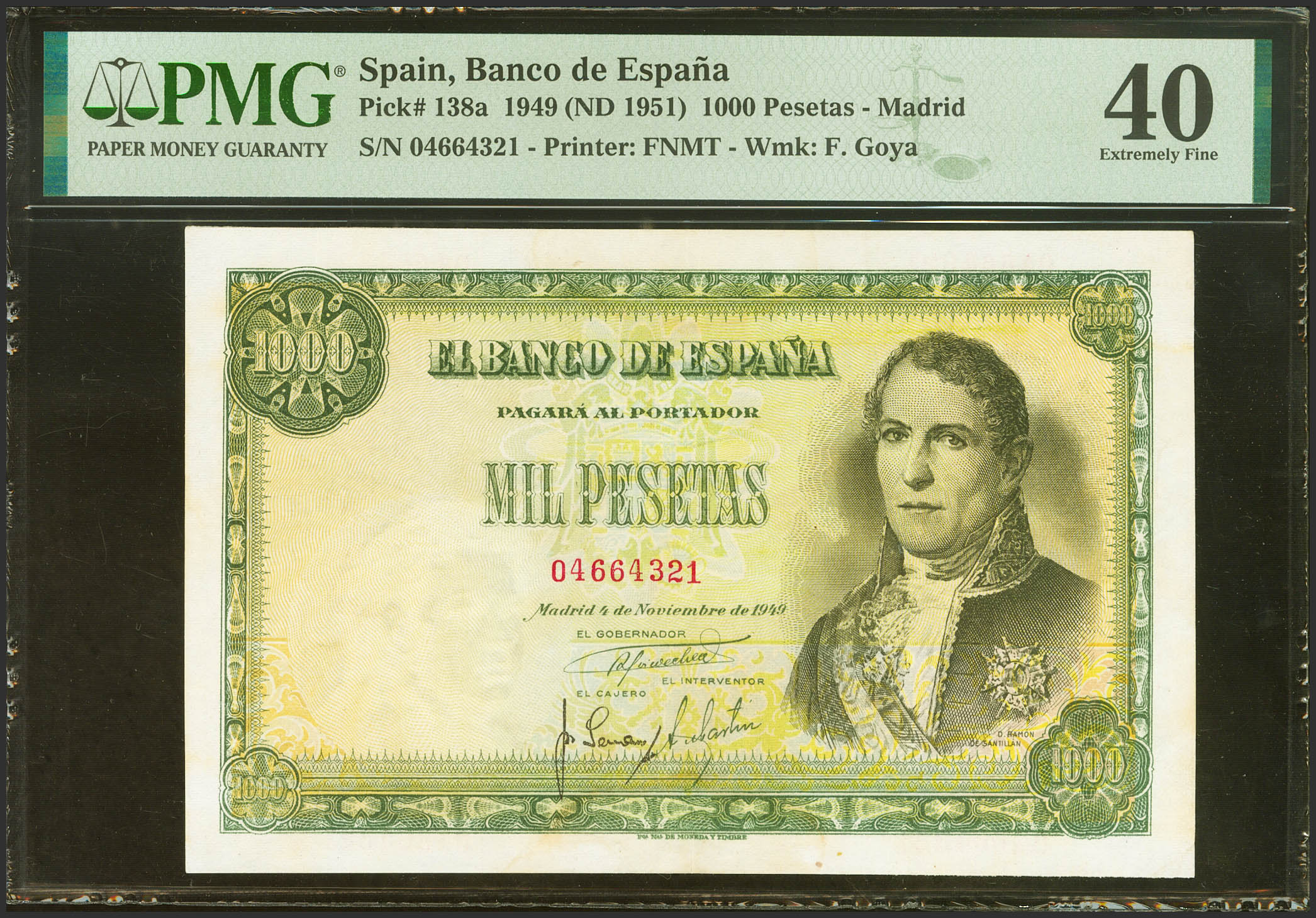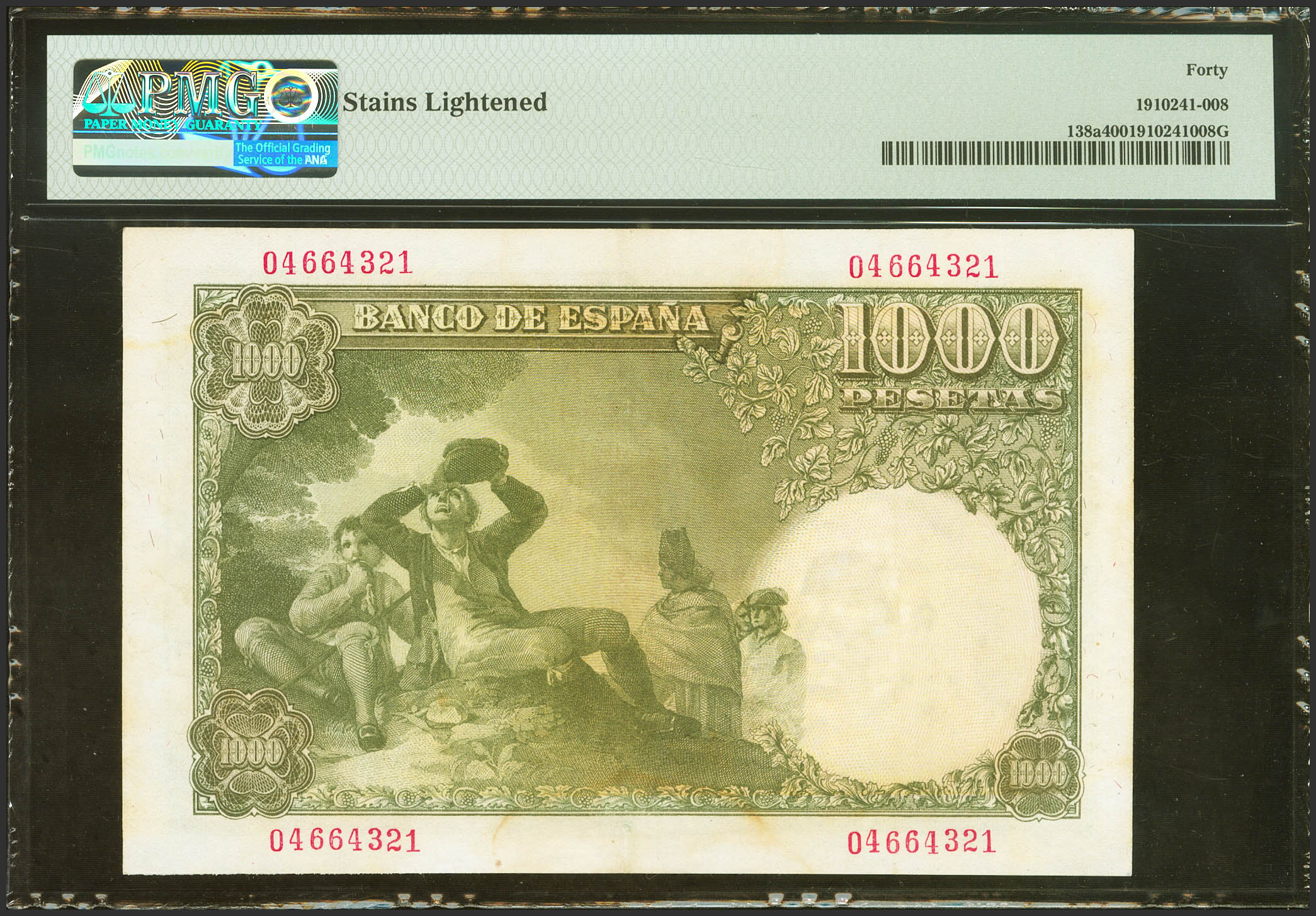 1000 Pesetas. November 4, 1949. No series. (Edifil 2023: 458, Pick: 138a). Spots of time. Almost Extremely Fine. PMG40 encapsulation (lightened stains)