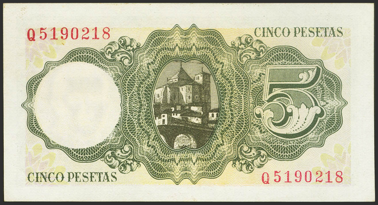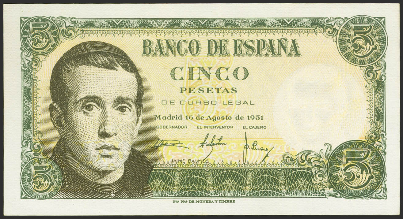5 Pesetas. August 16, 1951. Series Q. (Edifil 2021: 459a). Original sizing. Uncirculated.