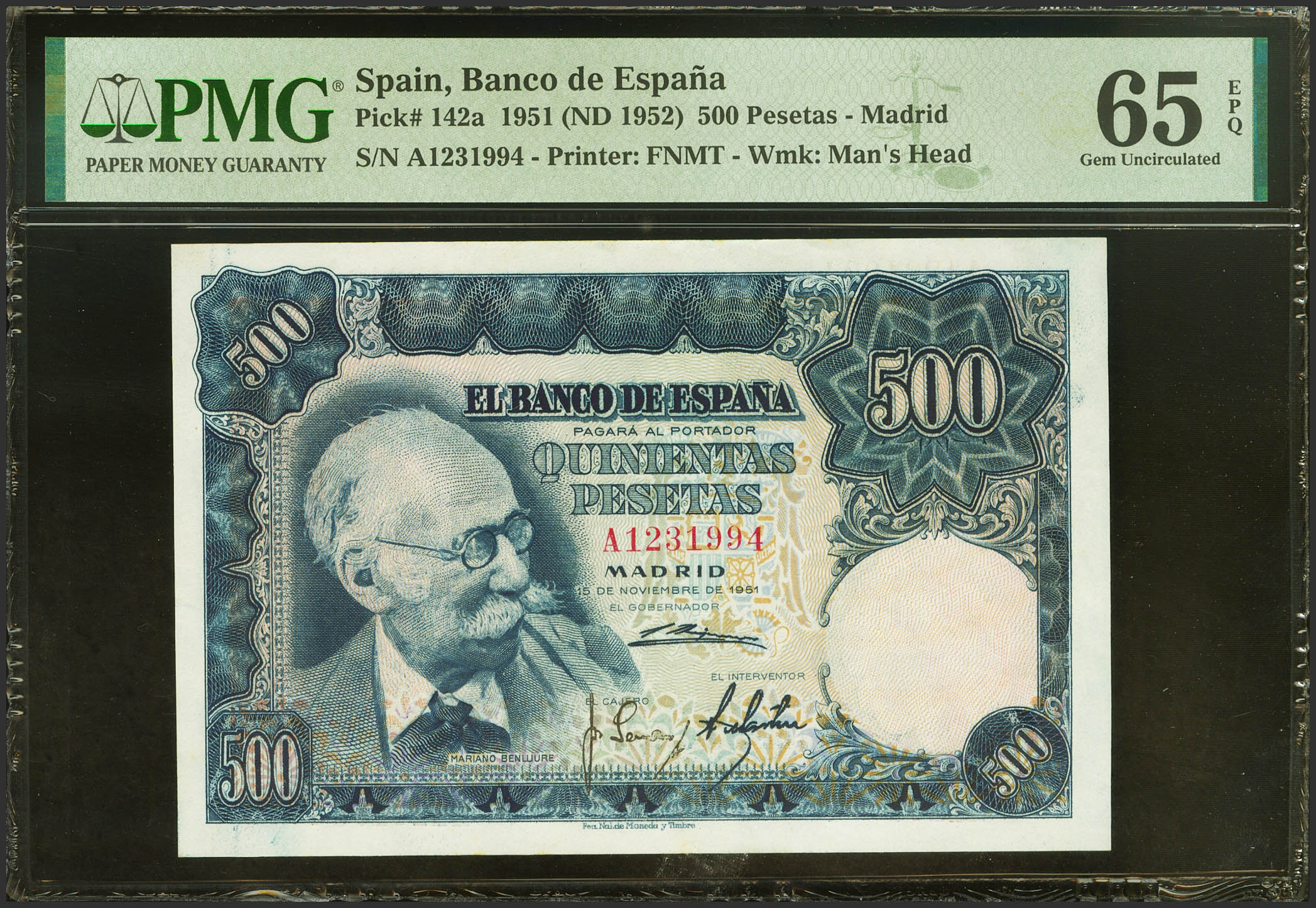 500 Pesetas. November 15, 1951. Series A. (Edifil 2021: 460a). Unusual in this quality, it retains all its original finish. Uncirculated. PMG65EPQ package.