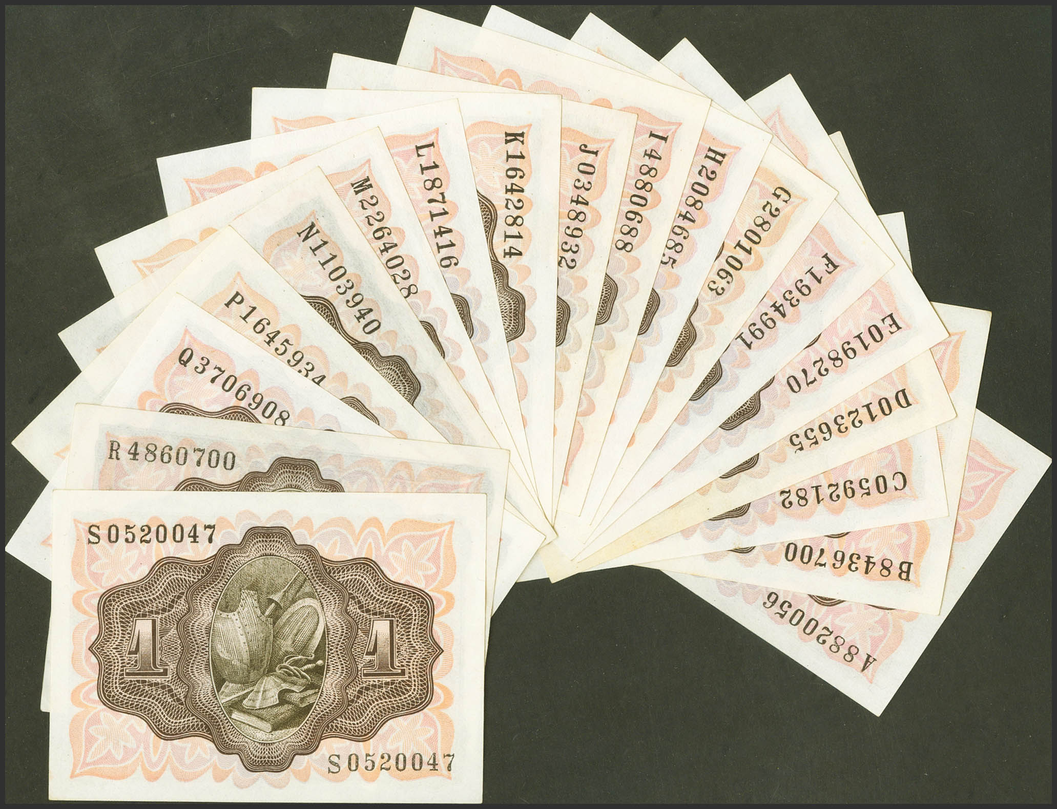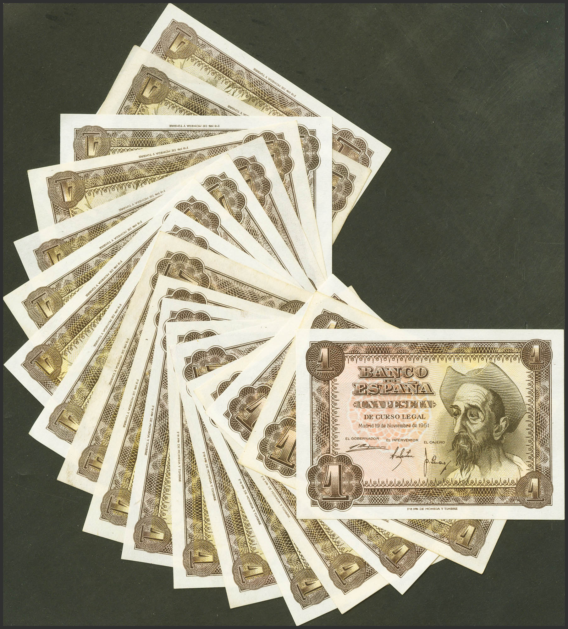 Set of 18 1 Peseta banknotes, issued on November 19, 1951, with the series A, B, C, D, E, F, G, H, I, J, K, L, M, N, P, Q , R and S, respectively (Edifil 2023: 461a), preserving its original preparation. Uncirculated/ Extremely Fine.