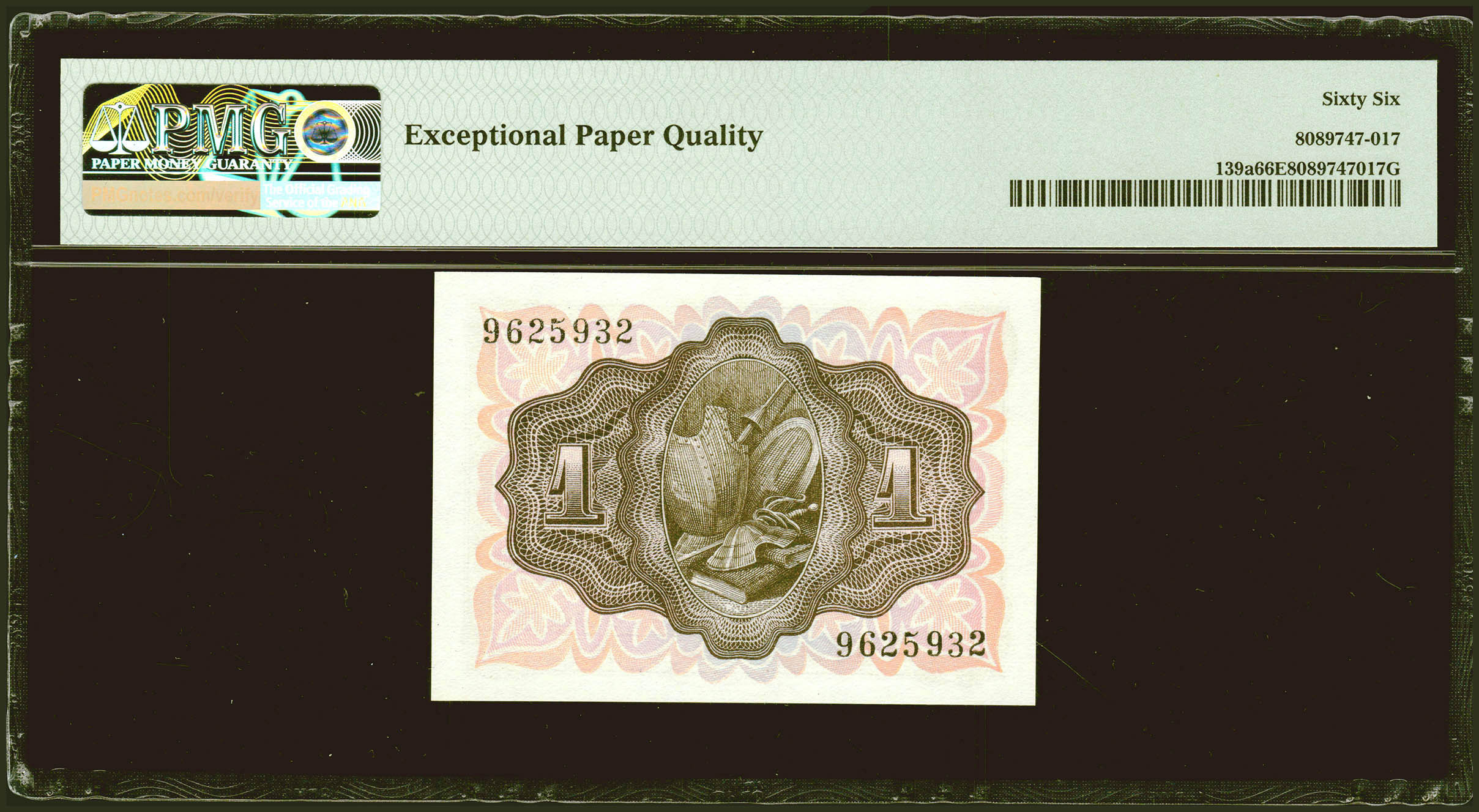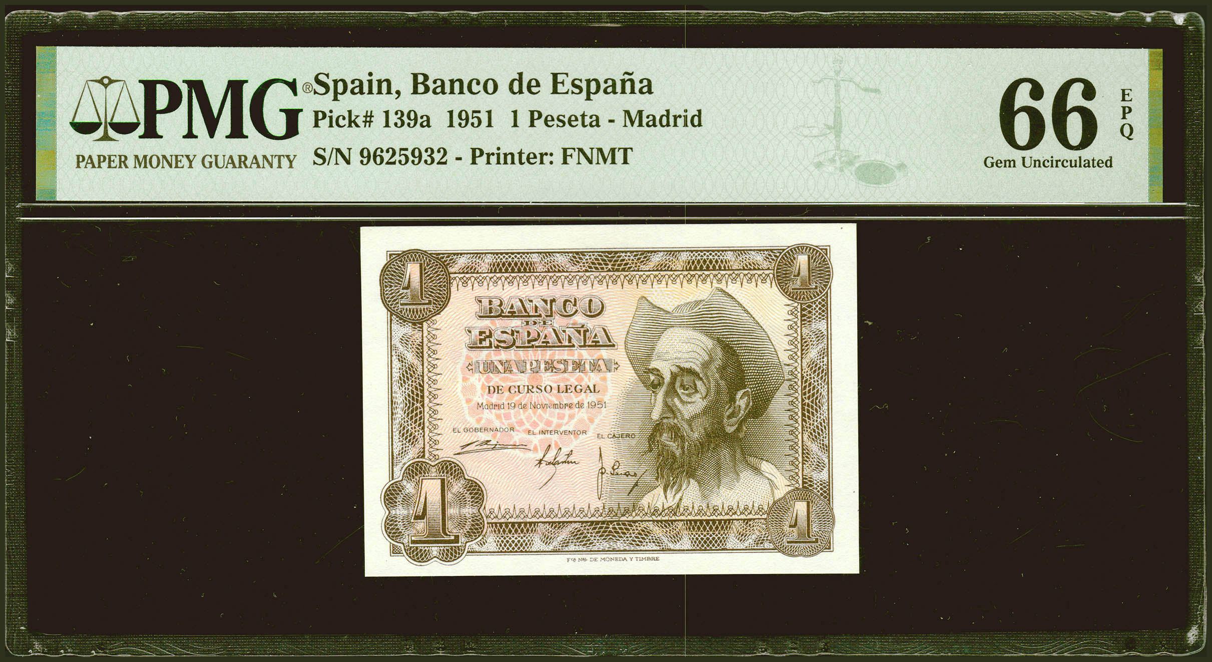 English 1 Peseta. November 19, 1951. No series. (Edifil 2021: 461, Pick: 139a). Rare in this exceptional quality, original sizing. Uncirculated. PMG66EPQ package.