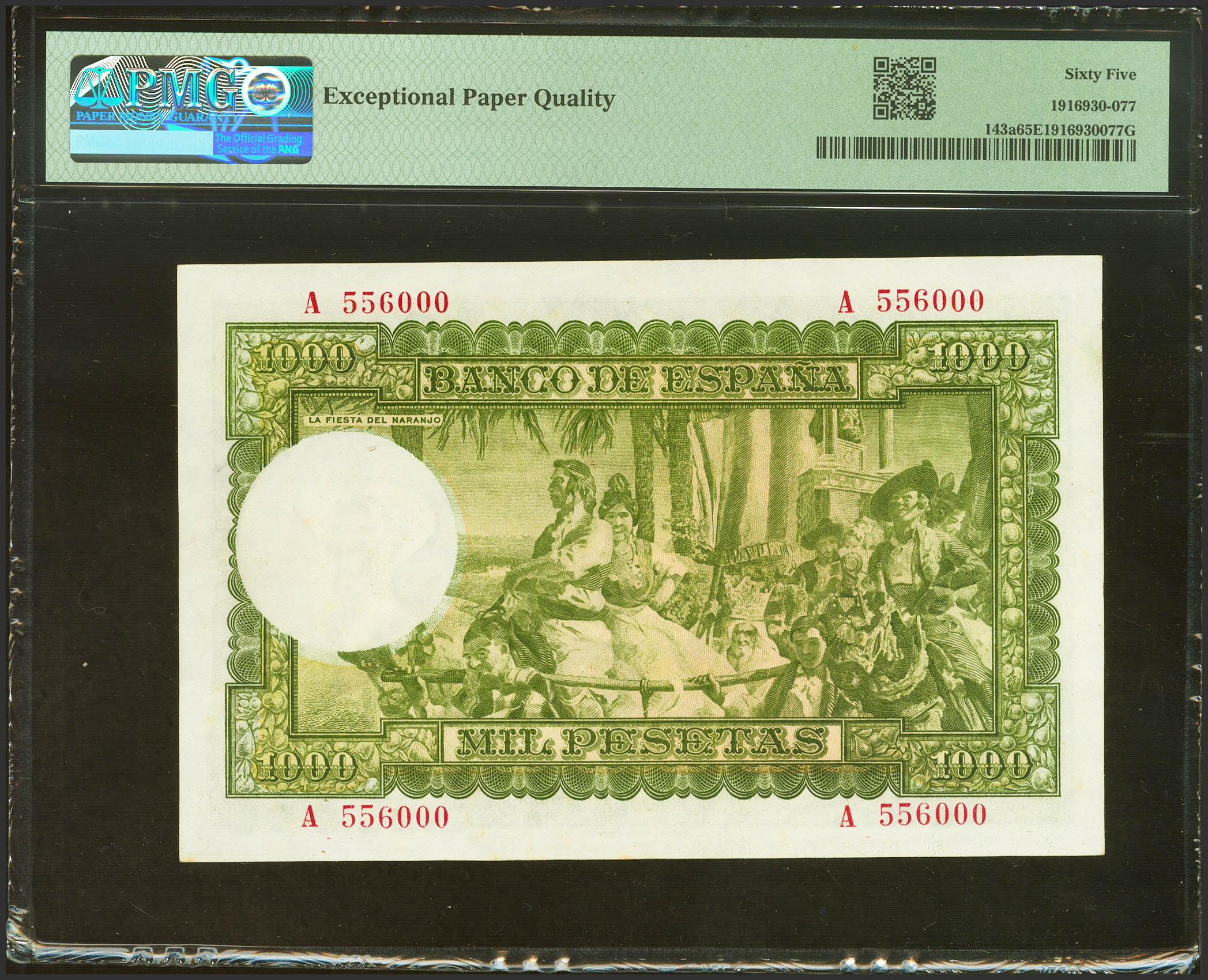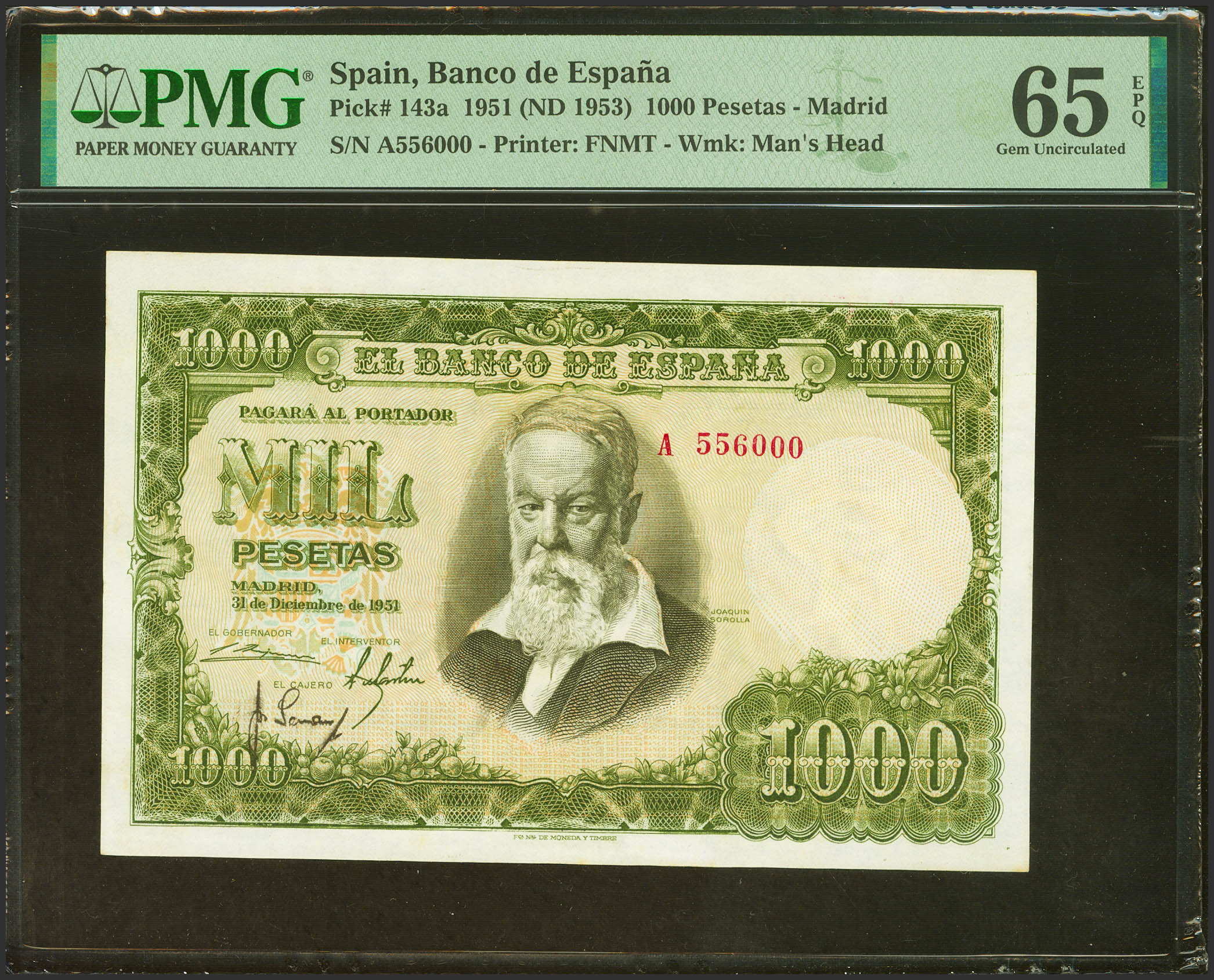 1000 Pesetas. December 31, 1951. Series A. (Edifil 2023: 463a, Pick: 143a). Rare in this exceptional quality, original sizing. Uncirculated. PMG65EPQ package.