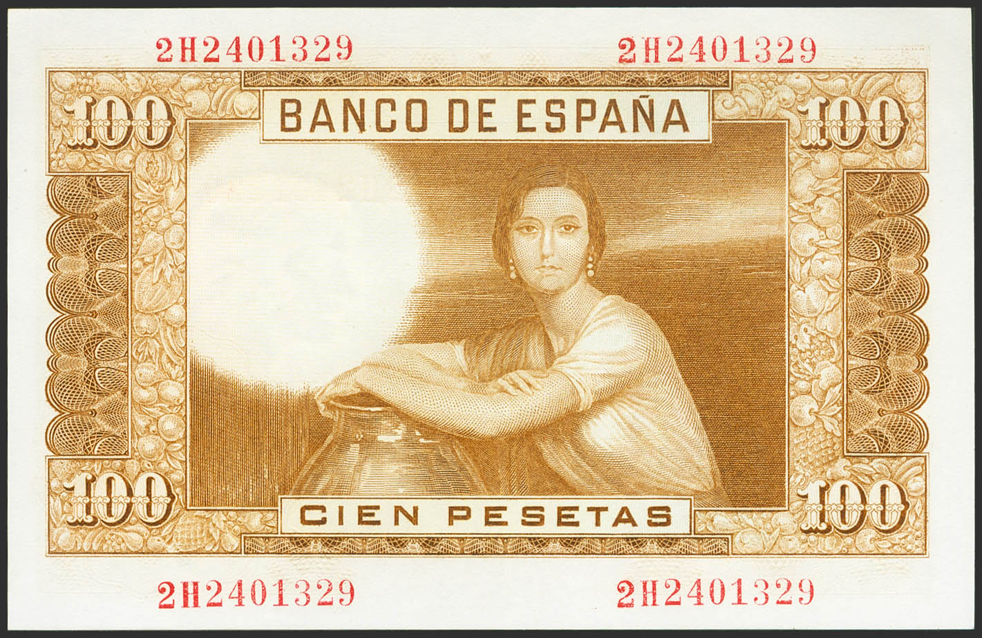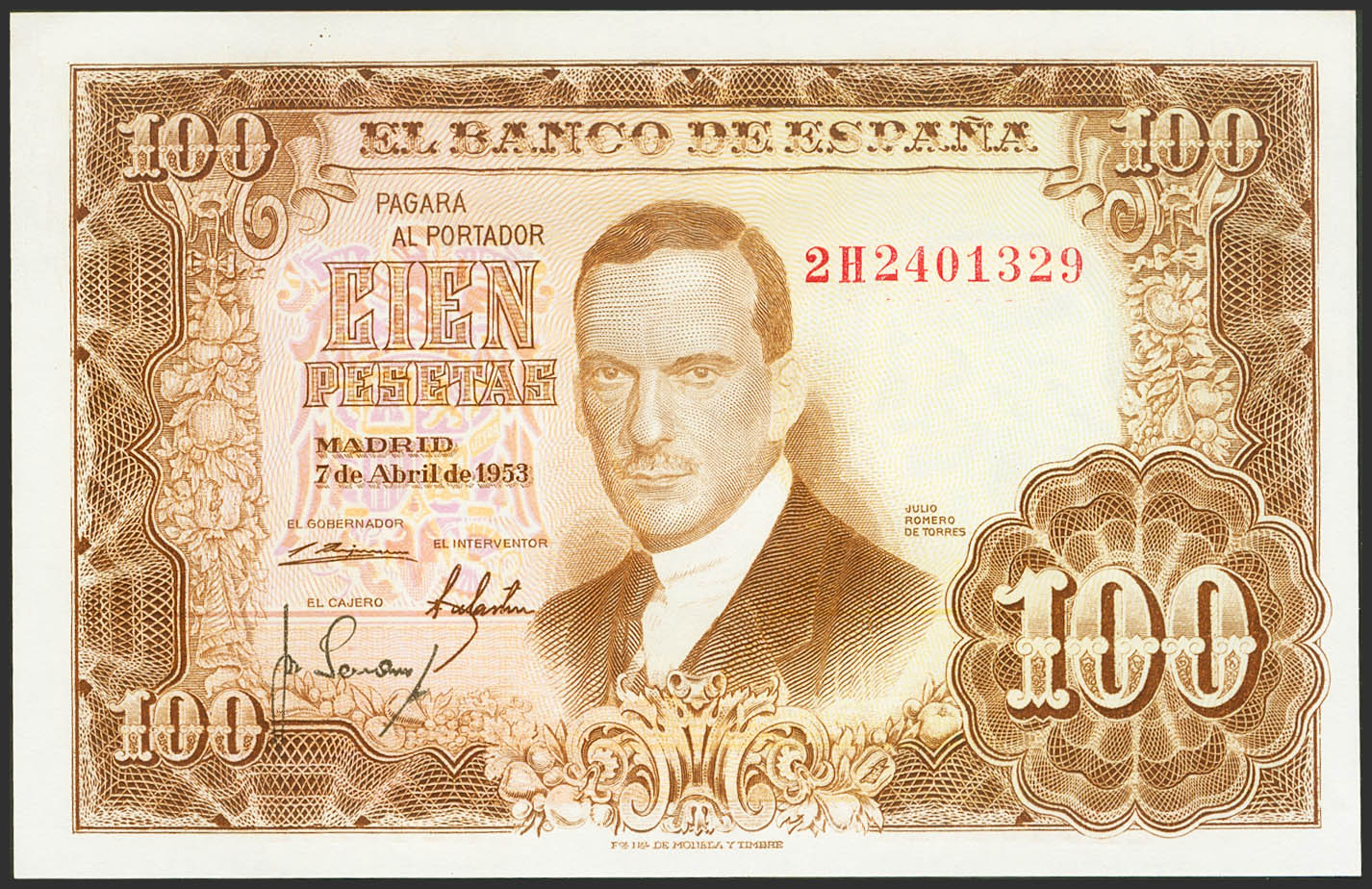 English 100 Pesetas. April 7, 1953. Series 2H. (Edifil 2023: 464c). Original sizing. Uncirculated.