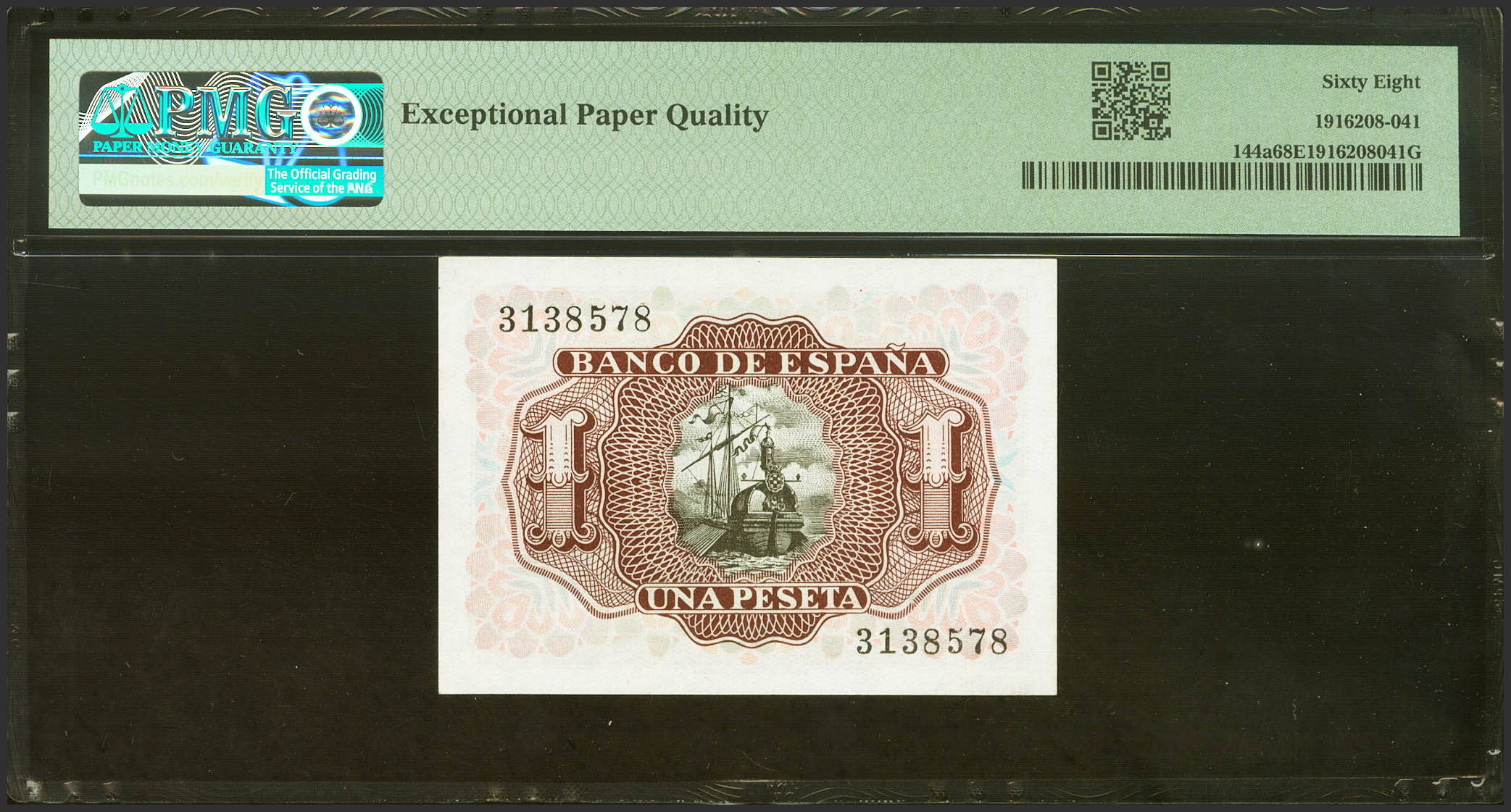 1 Peseta. July 22, 1953. No series. (Edifil 2021: 465, Pick: 144a). Rare in this exceptional quality, original sizing. Uncirculated. PMG68EPQ package.