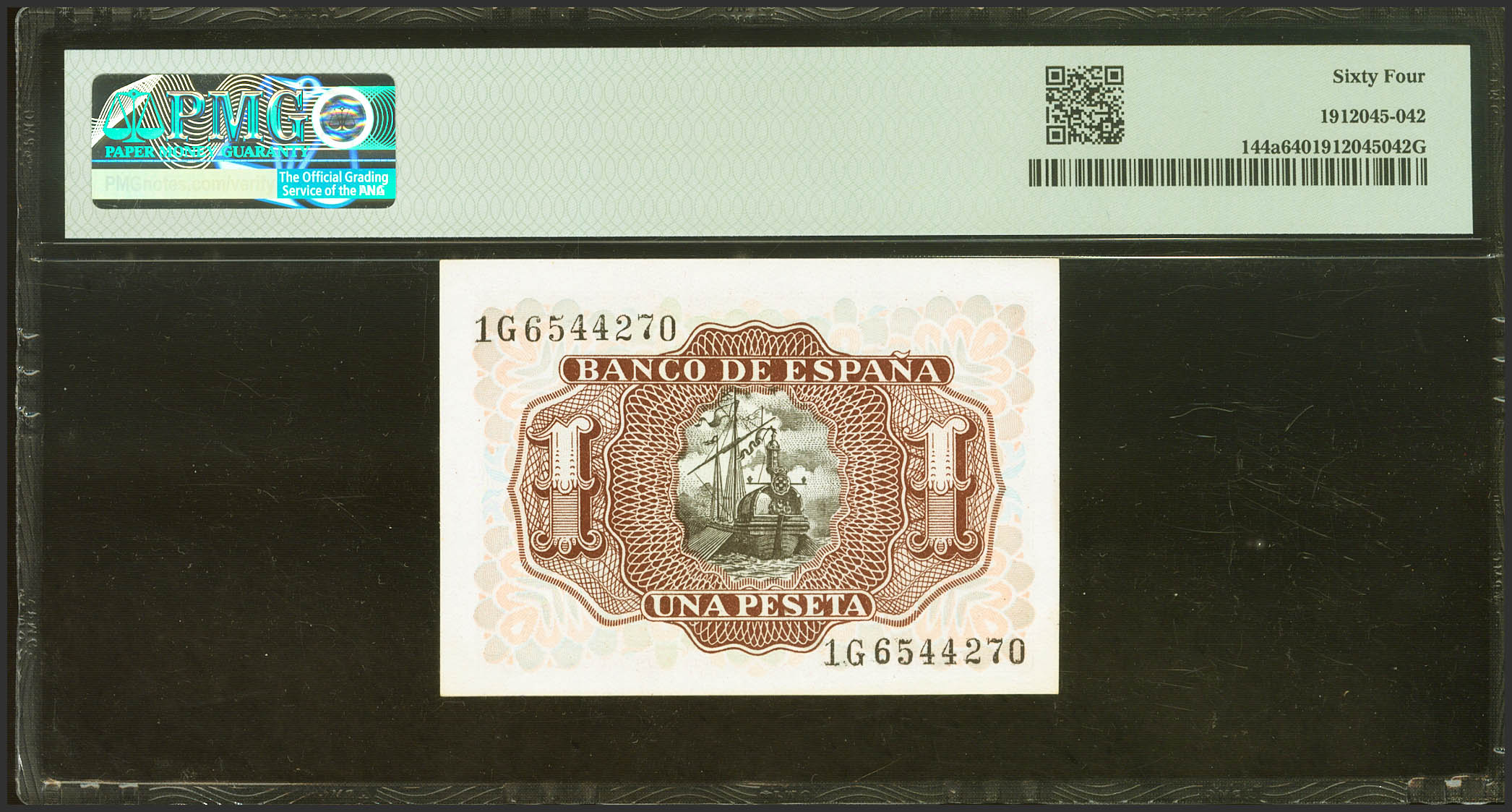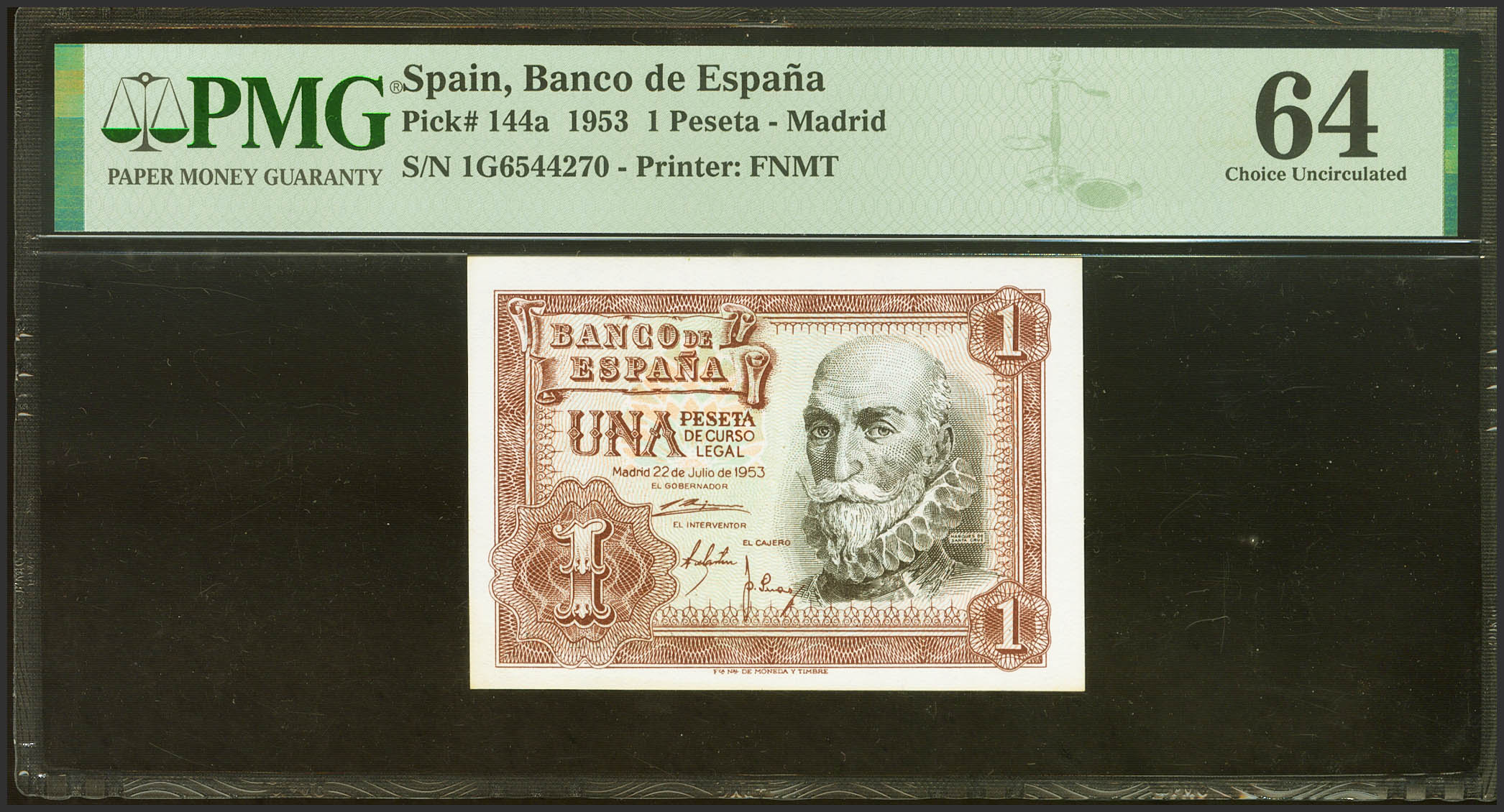 1 Peseta. July 22, 1953. Series 1G. (Edifil 2021: 465a, Pick: 144a). Uncirculated. PMG64 encapsulation.