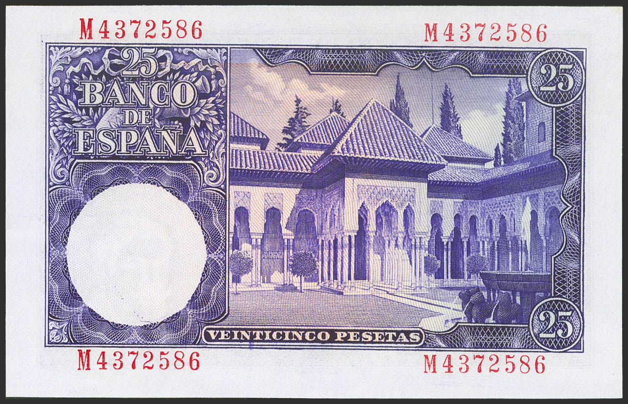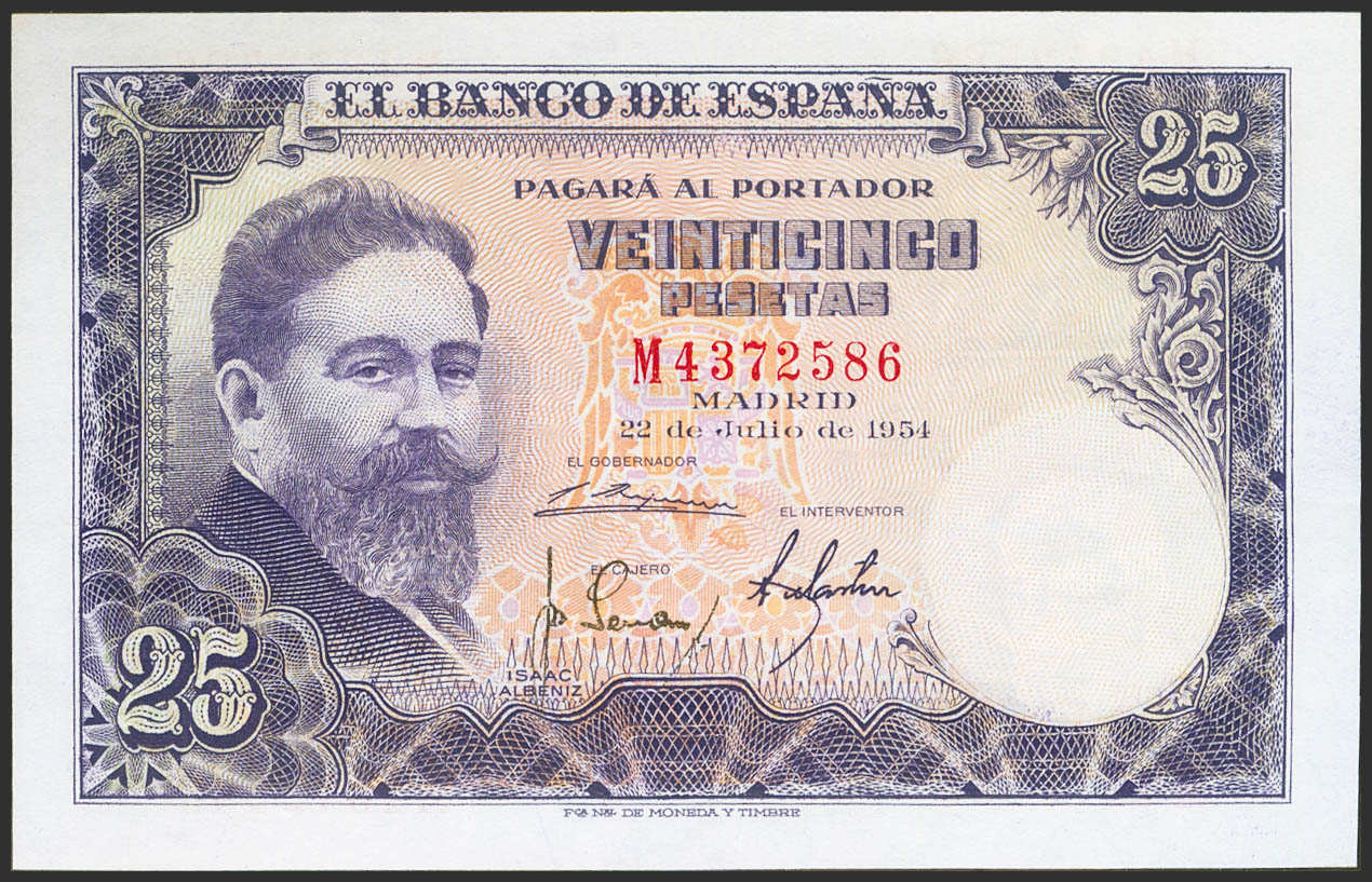 25 Pesetas. July 22, 1954. Series M. (Edifil 2023: 467a). Original sizing. Uncirculated.