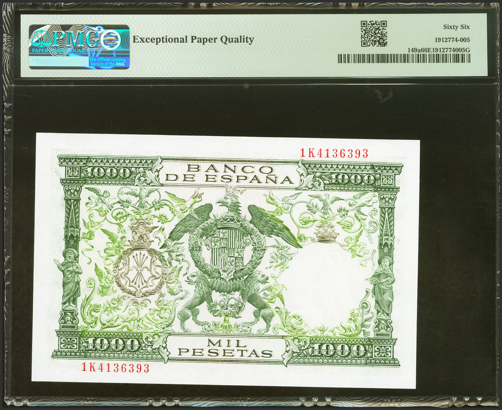1000 Pesetas. November 29, 1957. Series 1K. (Edifil 2021: 469b, Pick: 149a). Rare in this exceptional quality, original sizing. Uncirculated. PMG66EPQ package.