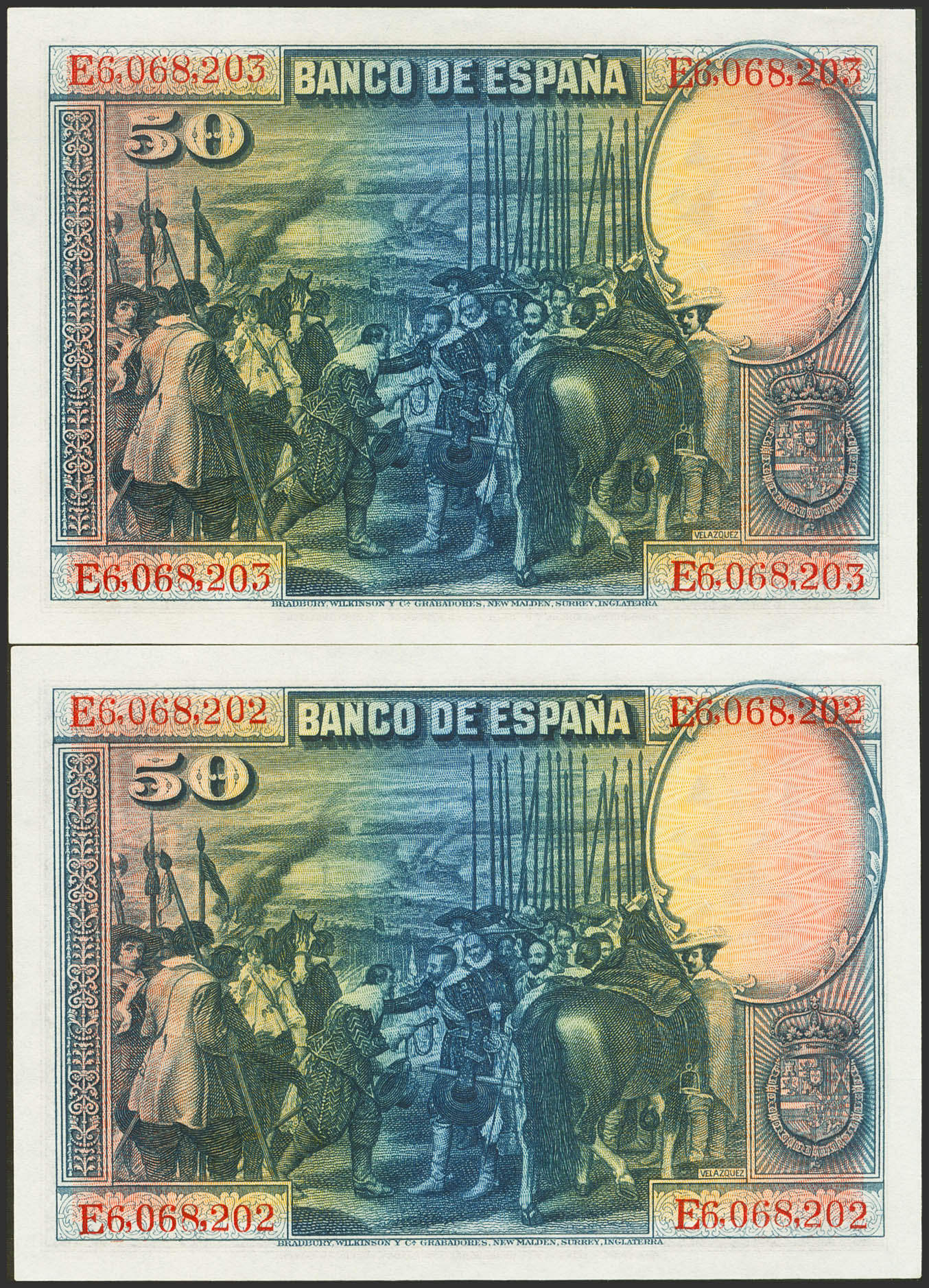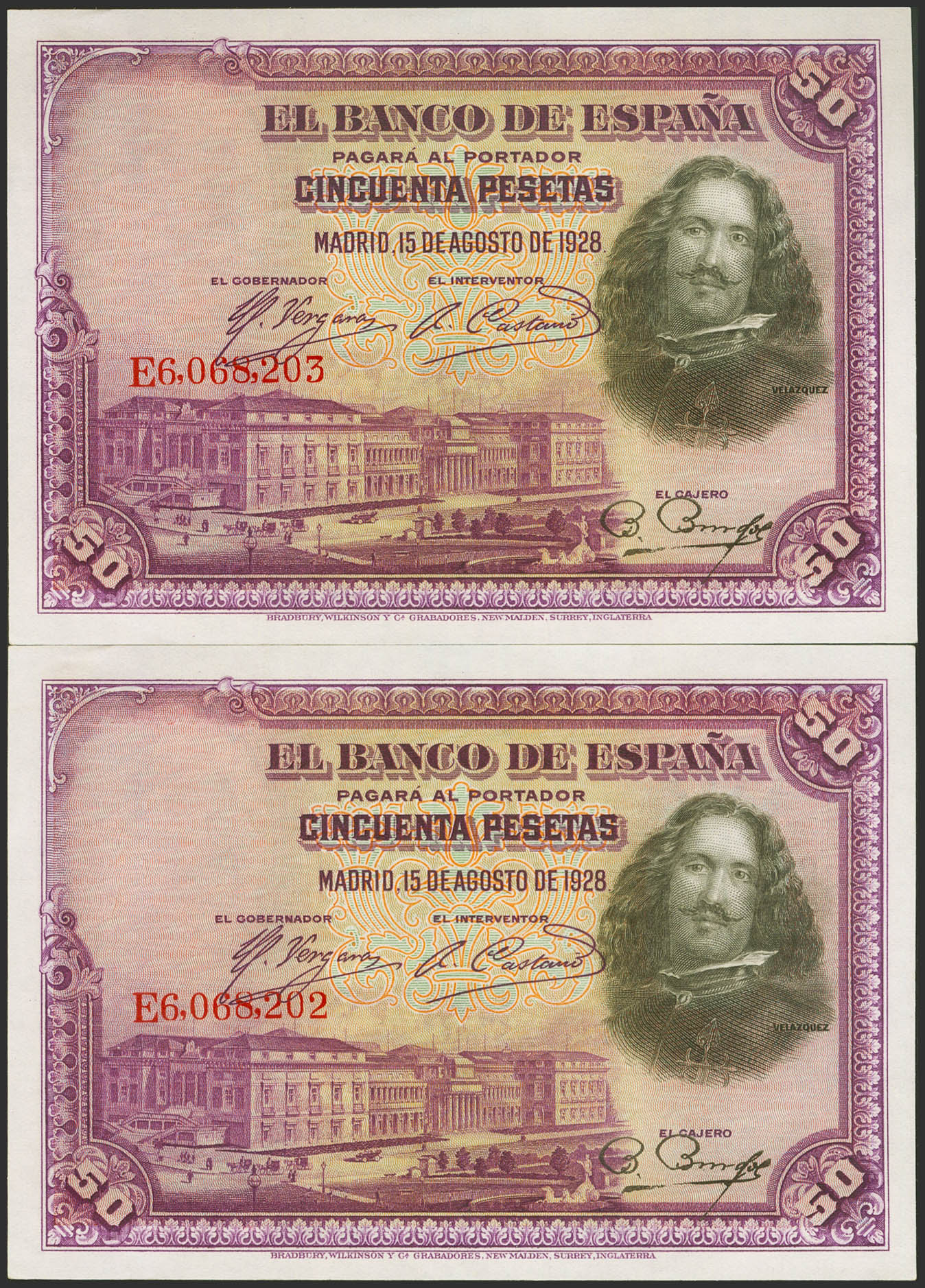 50 Pesetas. August 15, 1928. Correlative couple. Series E. (Edifil 2021: 354). It retains all its original finish. Uncirculated.