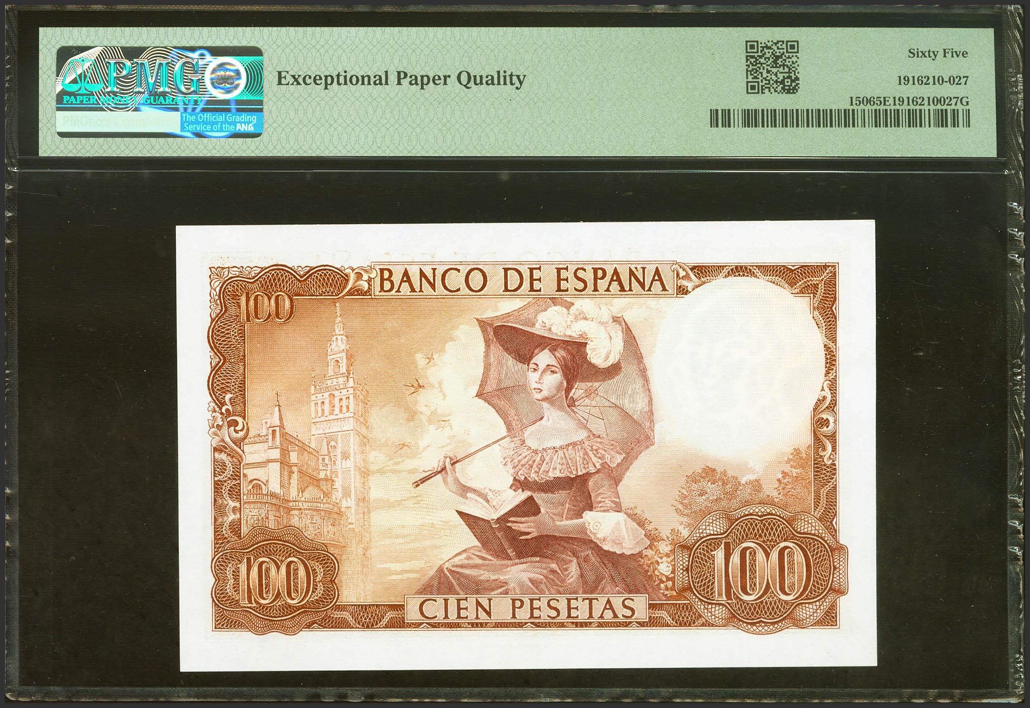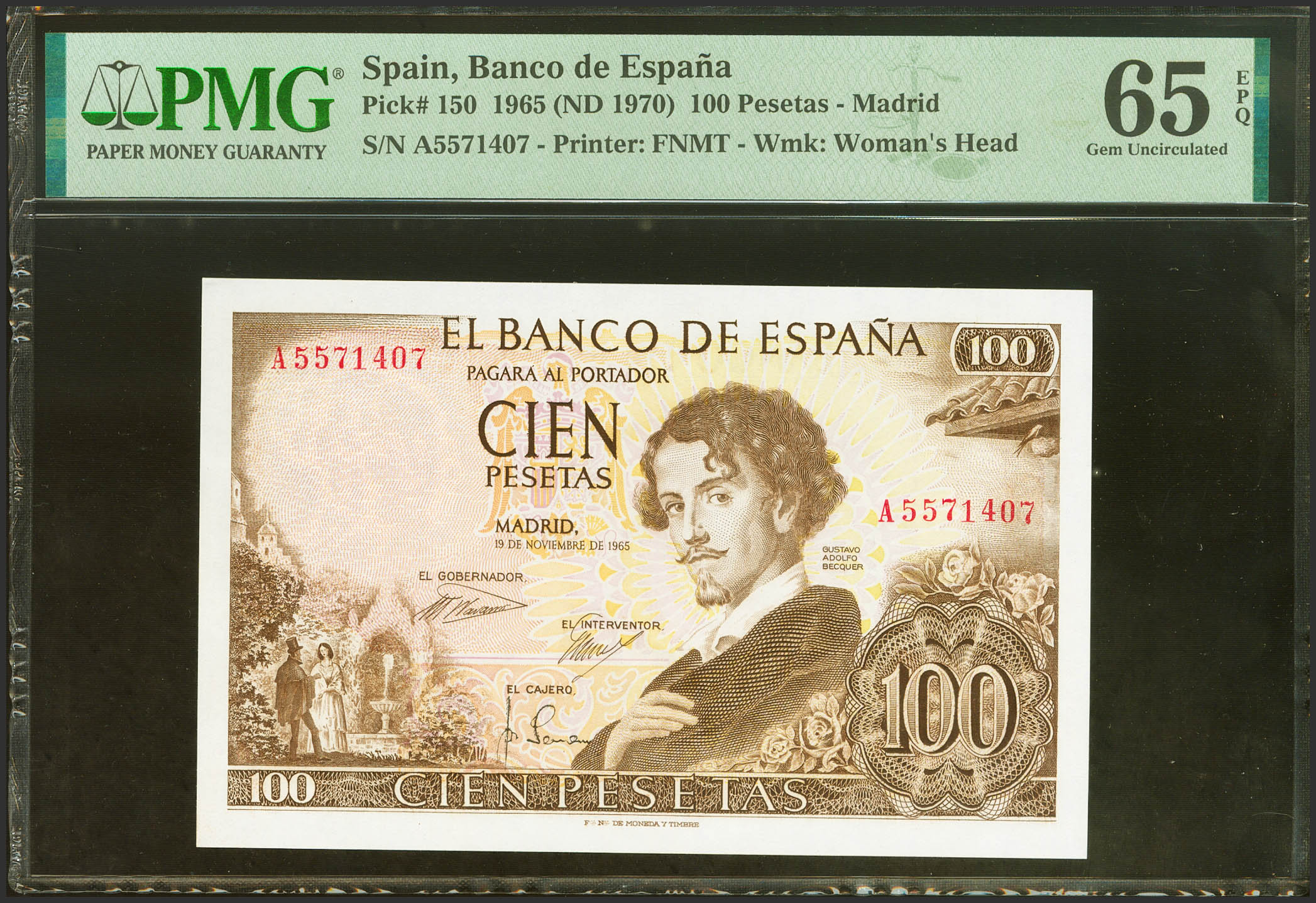 English 100 Pesetas. November 19, 1965. Series A. (Edifil 2023: 470a, Pick: 150). Original sizing. PMG65EPQ package.