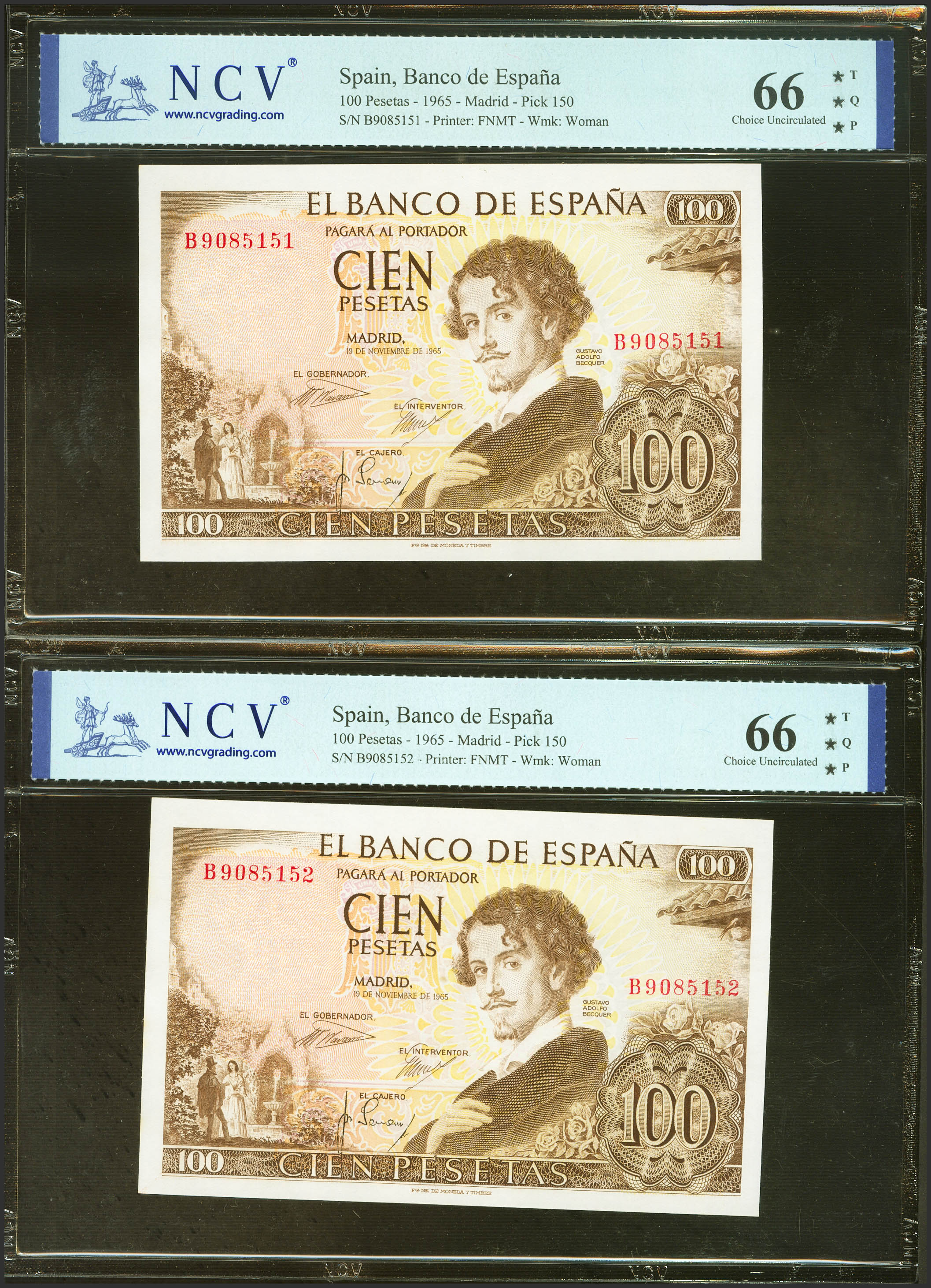 100 Pesetas. November 19, 1965. Correlative couple. Series B. (Edifil 2023: 470a, Pick: 150). Original sizing. NCV66TQP packages, both.