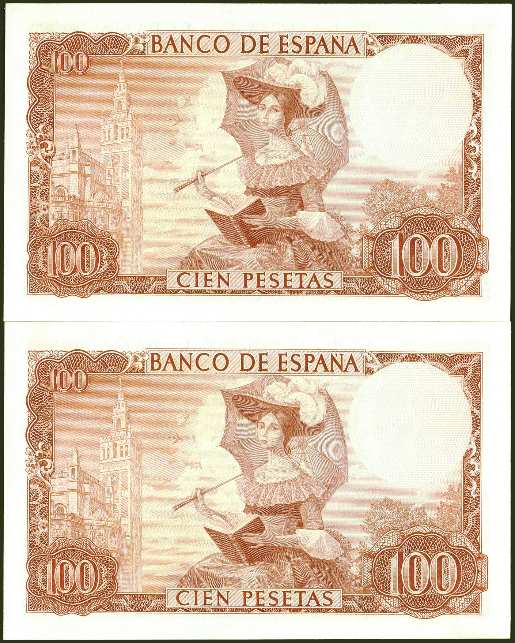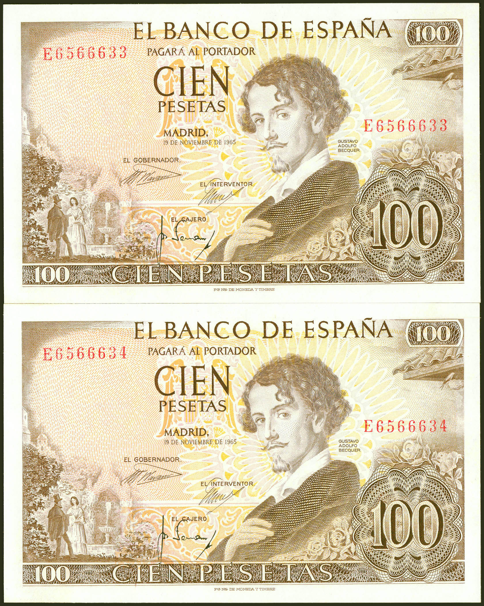 English 100 Pesetas. November 19, 1965. Correlative couple. Series E. (Edifil 2021: 470a). It retains all its original finish. Uncirculated.