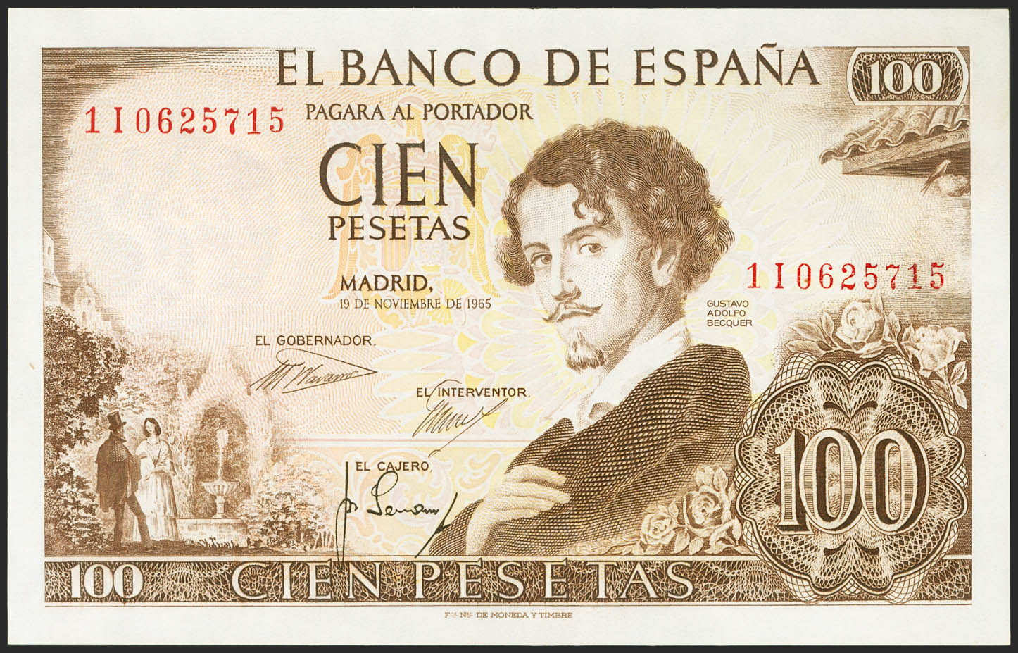 English 100 Pesetas. November 19, 1965. Series 1I. (Edifil 2021: 470a). It retains all its original finish. EBC++.