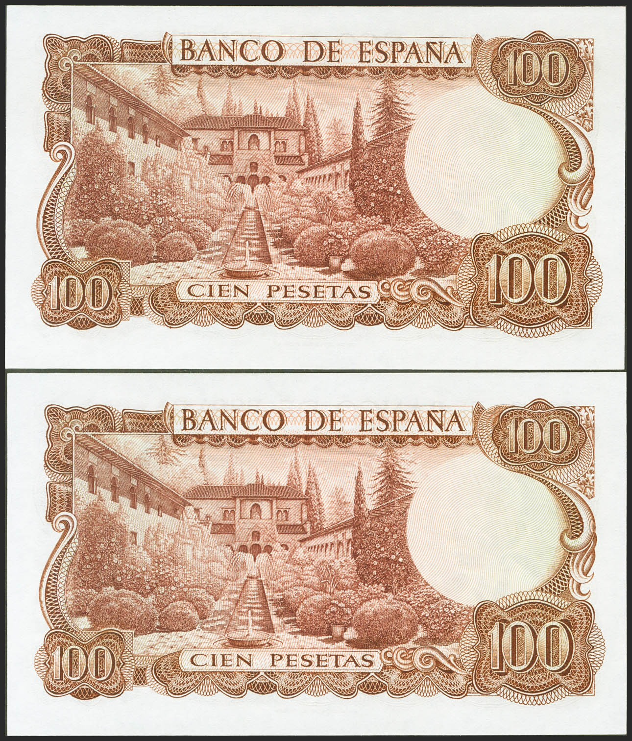 100 Pesetas. November 17, 1970. Correlative couple. Special series 9A. (Edifil 2021: 472d). It retains all its original finish. Uncirculated.