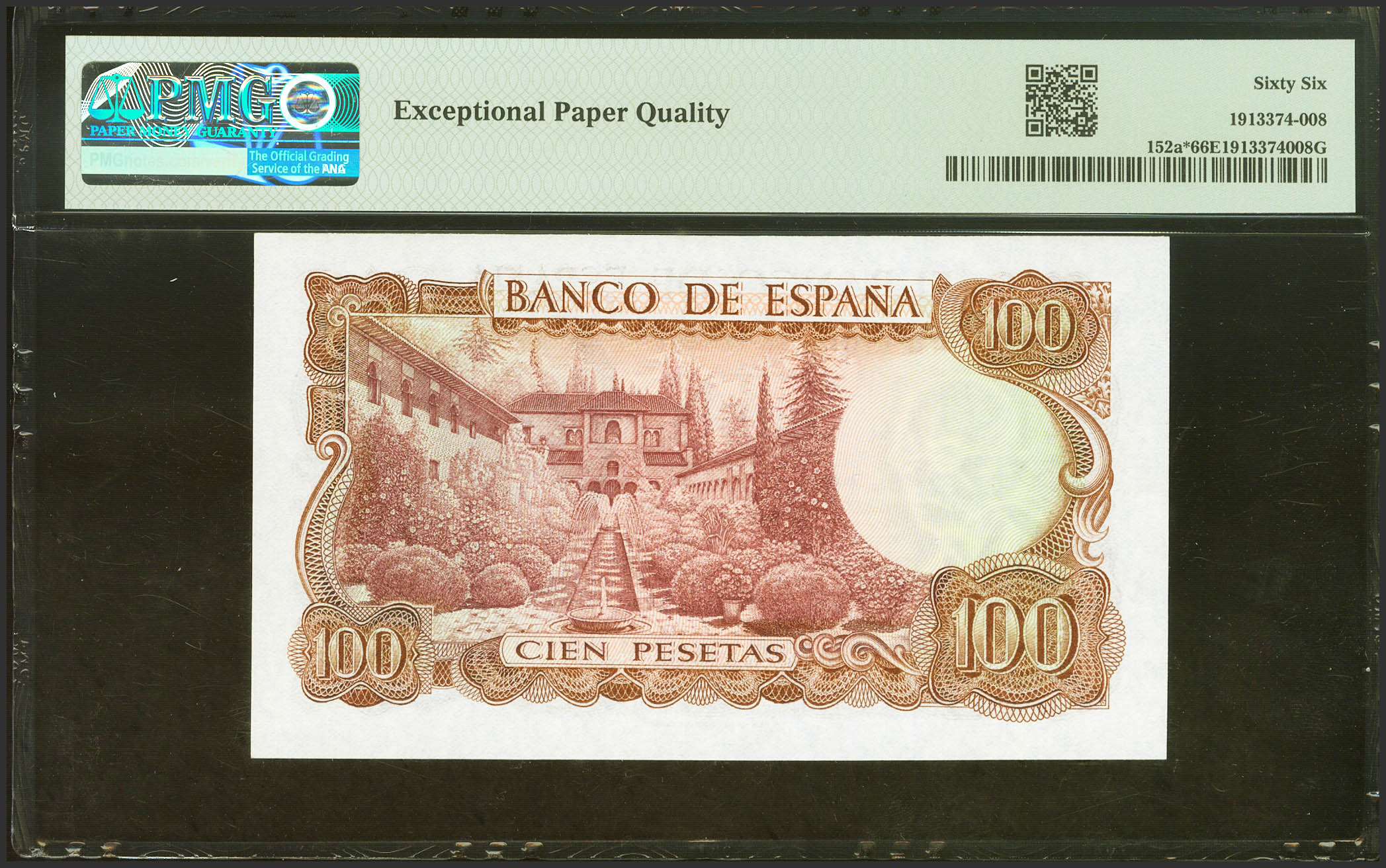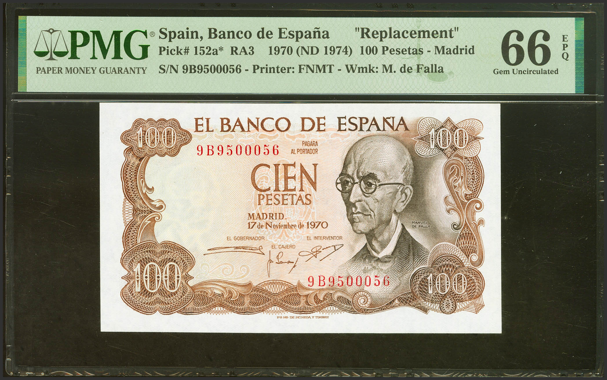 English 100 Pesetas. November 17, 1970. Special series 9B. (Edifil 2021: 472d, Pick: 152a*). Original sizing. Uncirculated. PMG66EPQ package.