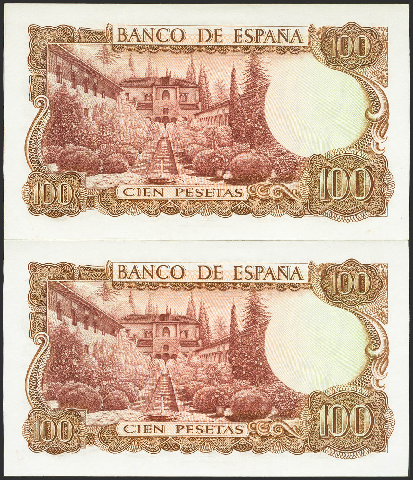 100 Pesetas. November 17, 1970. Correlative couple. Series 7W, last series issued. (Edifil 2023: 472c). Uncirculated.