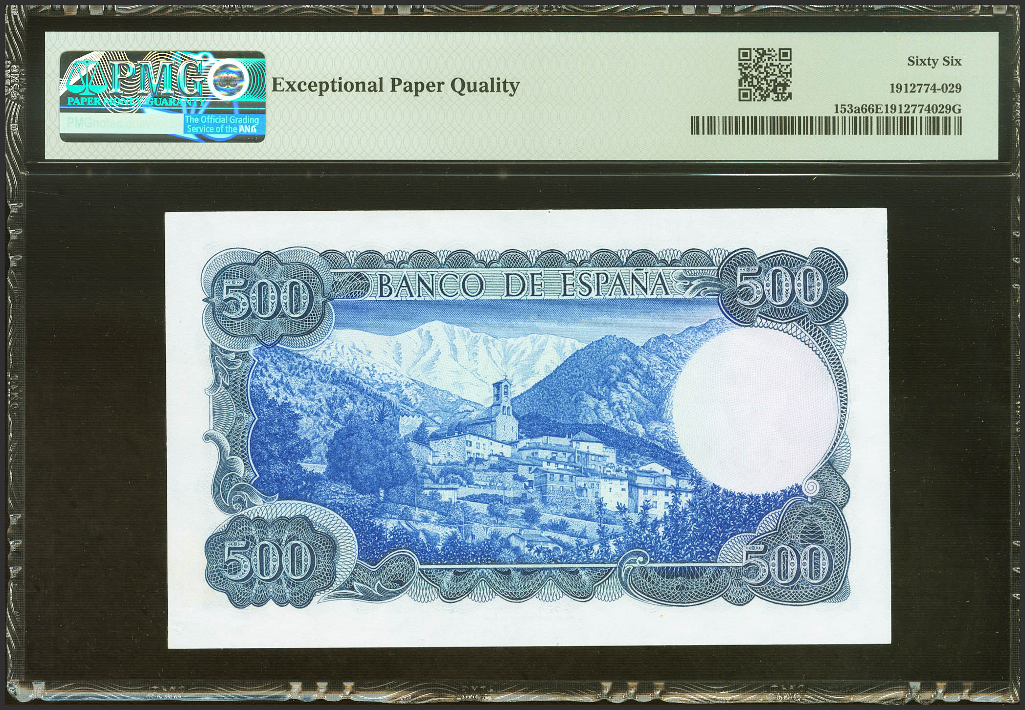 500 Pesetas. July 23, 1971. No series. (Edifil 2021: 473, Pick: 153a). Rare in this quality, original finish. PMG66EPQ package.
