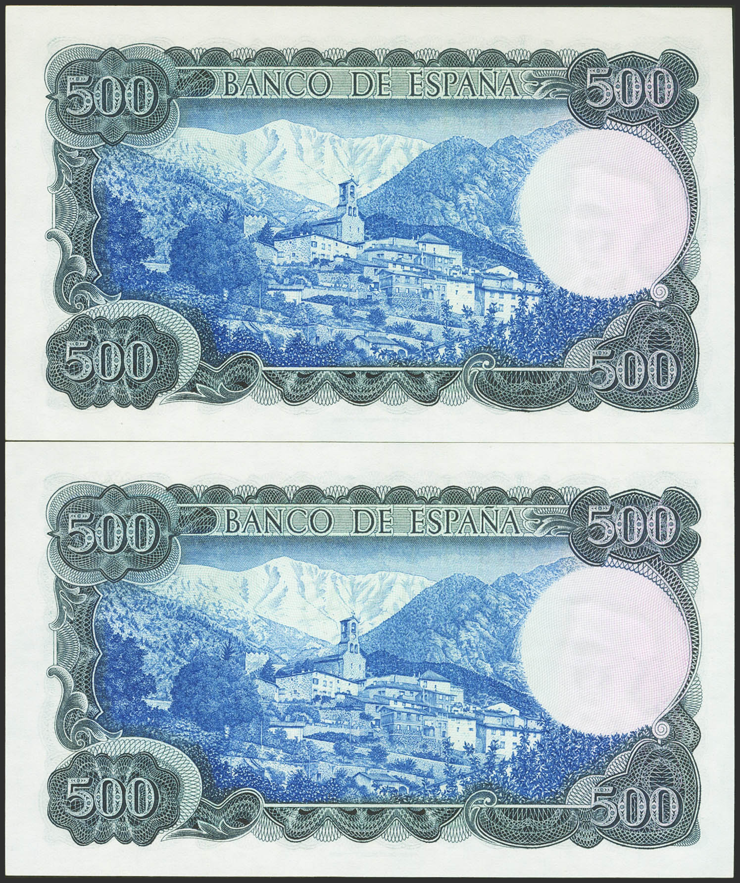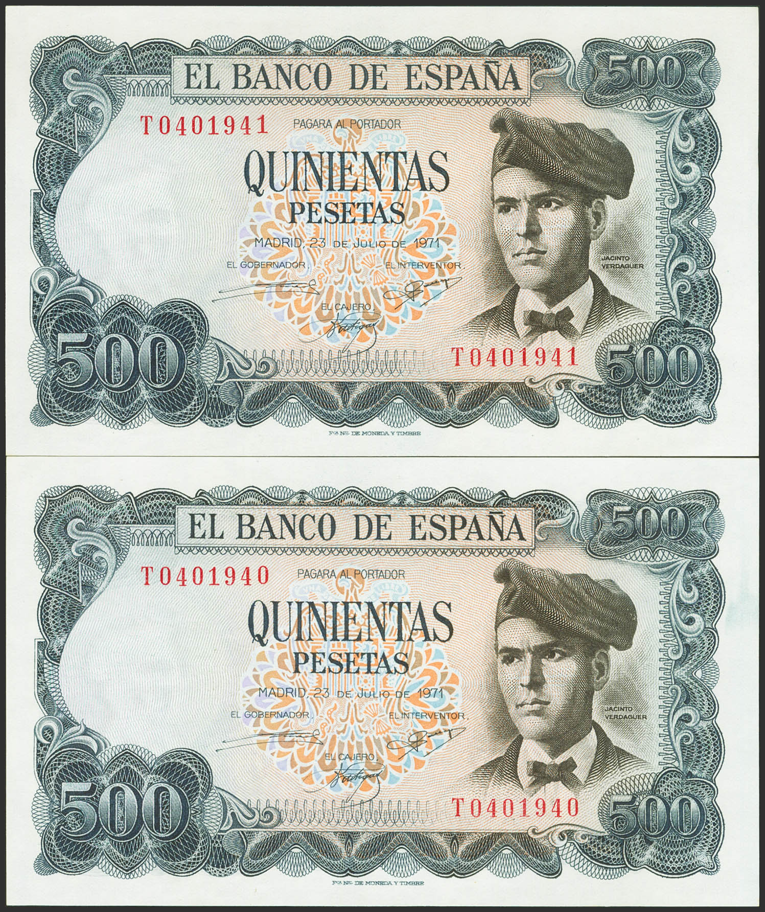 500 Pesetas. July 23, 1971. Correlative couple. Series T. (Edifil 2023: 473a). It retains all its original finish. Uncirculated.