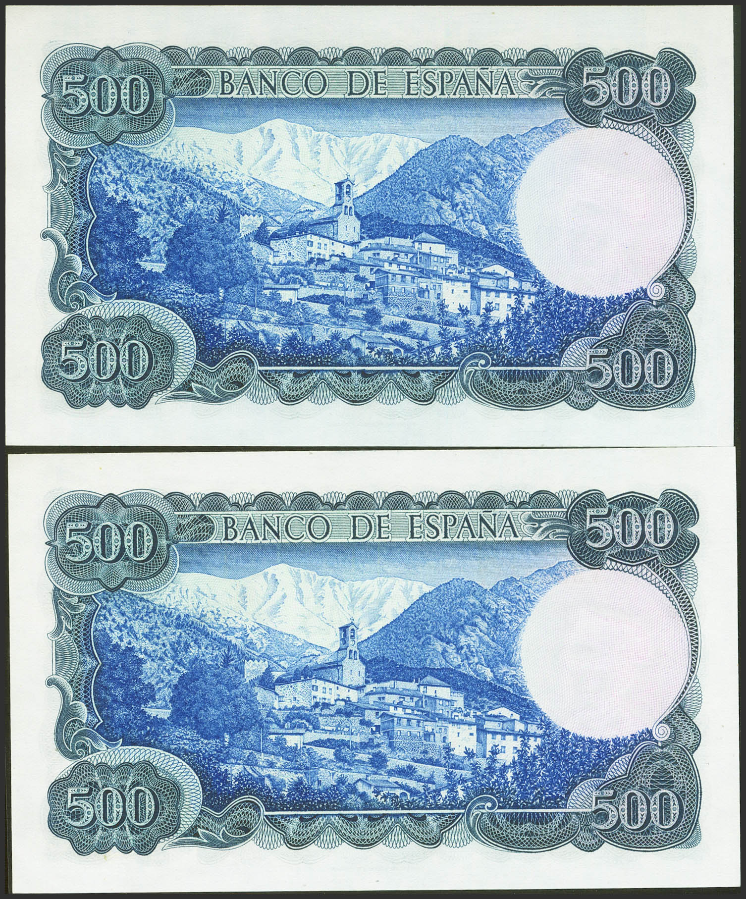 500 Pesetas. July 23, 1971. Correlative couple. Series V. (Edifil 2023: 473a). It retains all its original finish. Almost Uncirculated.