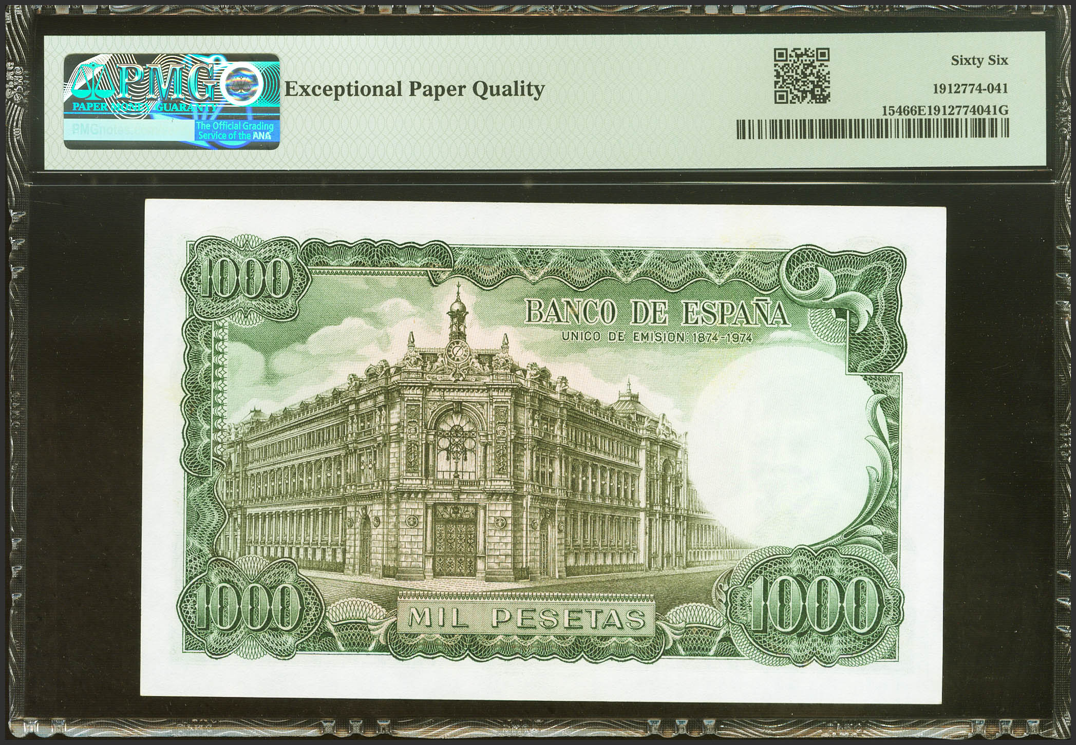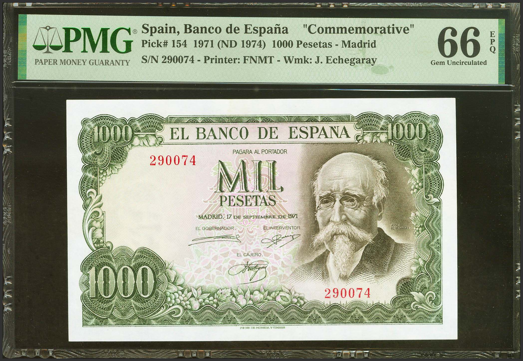 1000 Pesetas. September 17, 1971. No series. (Edifil 2021: 474, Pick: 154). Rare in this exceptional quality, original sizing. Uncirculated. PMG66EPQ package.