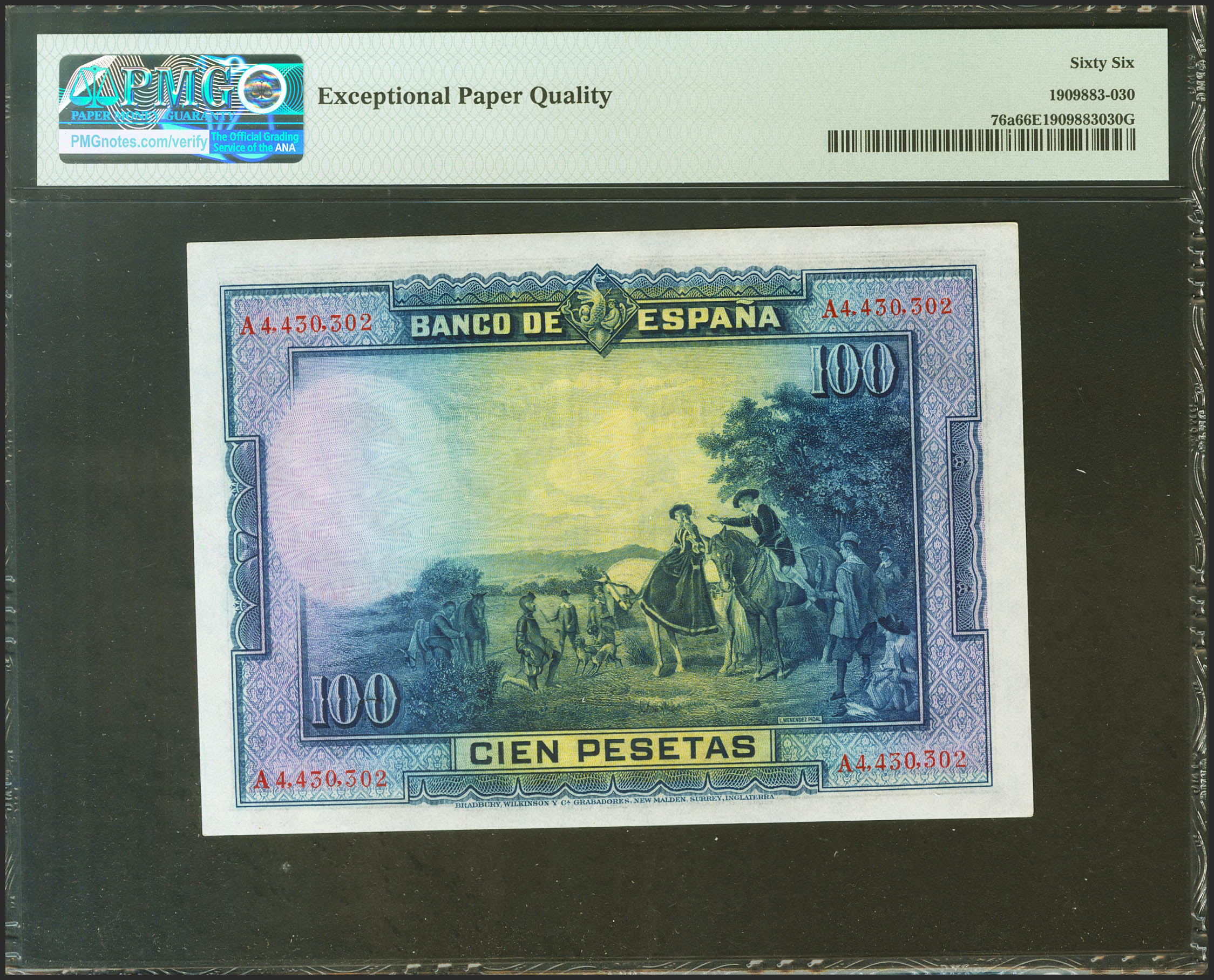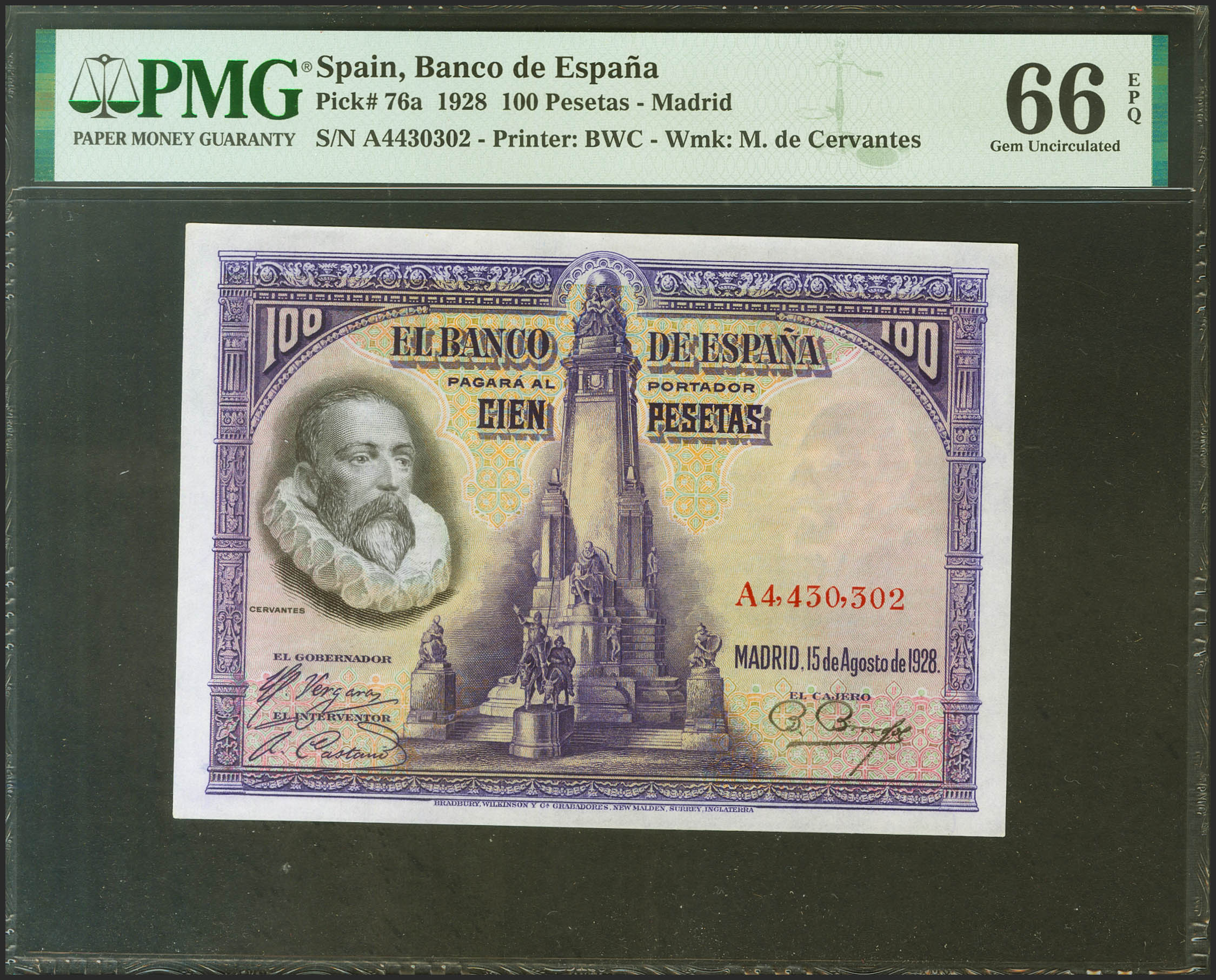 100 Pesetas. August 15, 1928. Series A. (Edifil 2021: 355a, Pick: 76a). Rare in this exceptional quality, original sizing. Uncirculated. PMG66EPQ package.