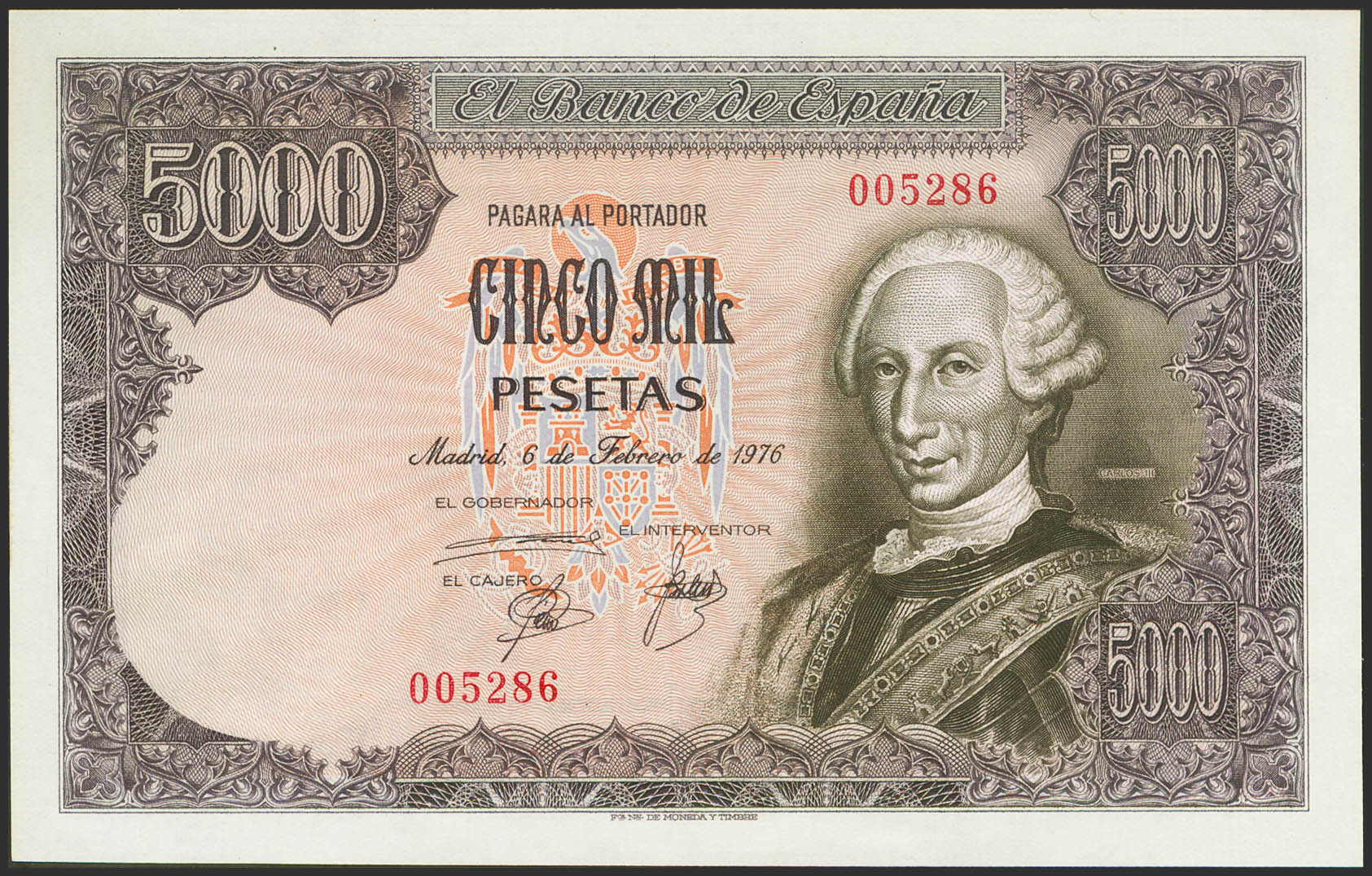 5000 Pesetas. February 6, 1976. No series and very low numbering. (Edifil 2023: 475). Very rare. Uncirculated.
