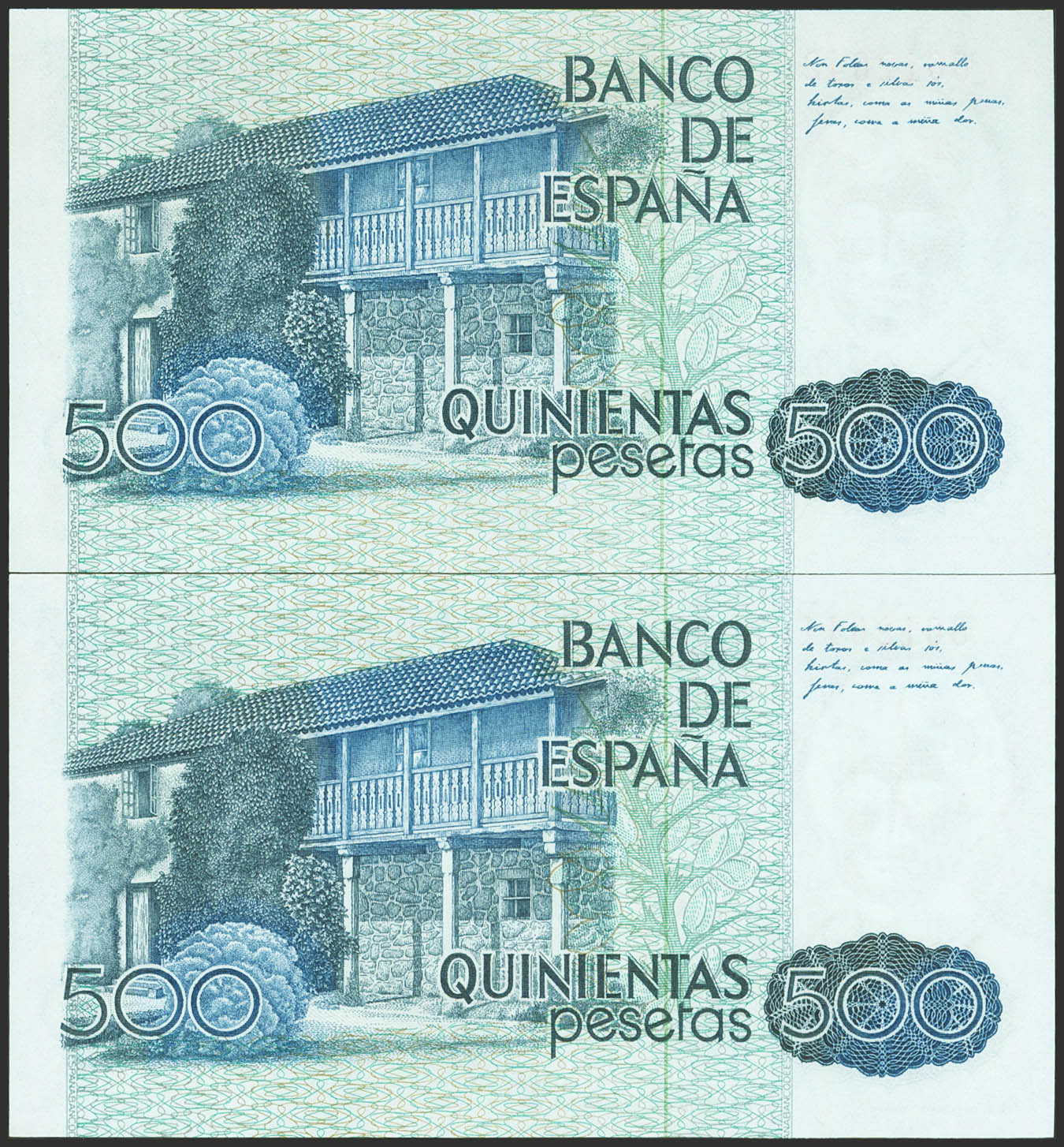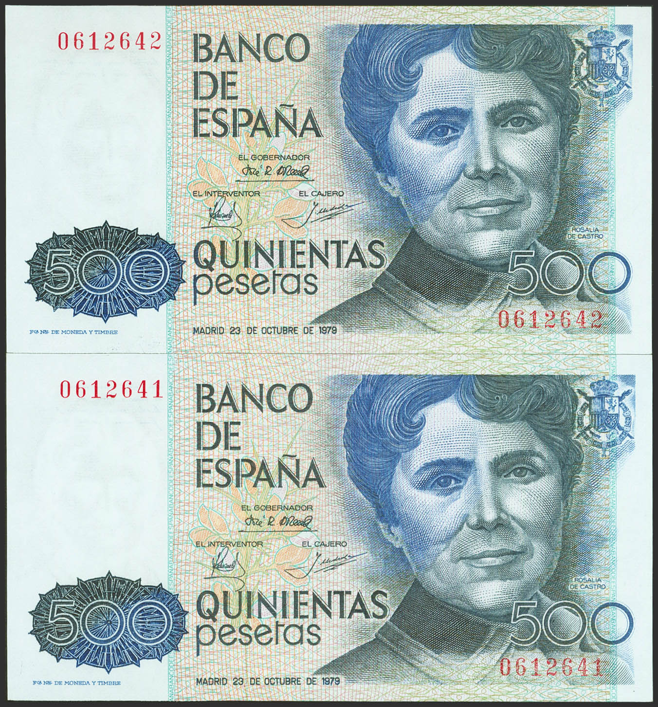 500 Pesetas. October 23, 1979. Correlative couple. No serie. (Edifil 2023: 476). Almost Uncirculated-.
