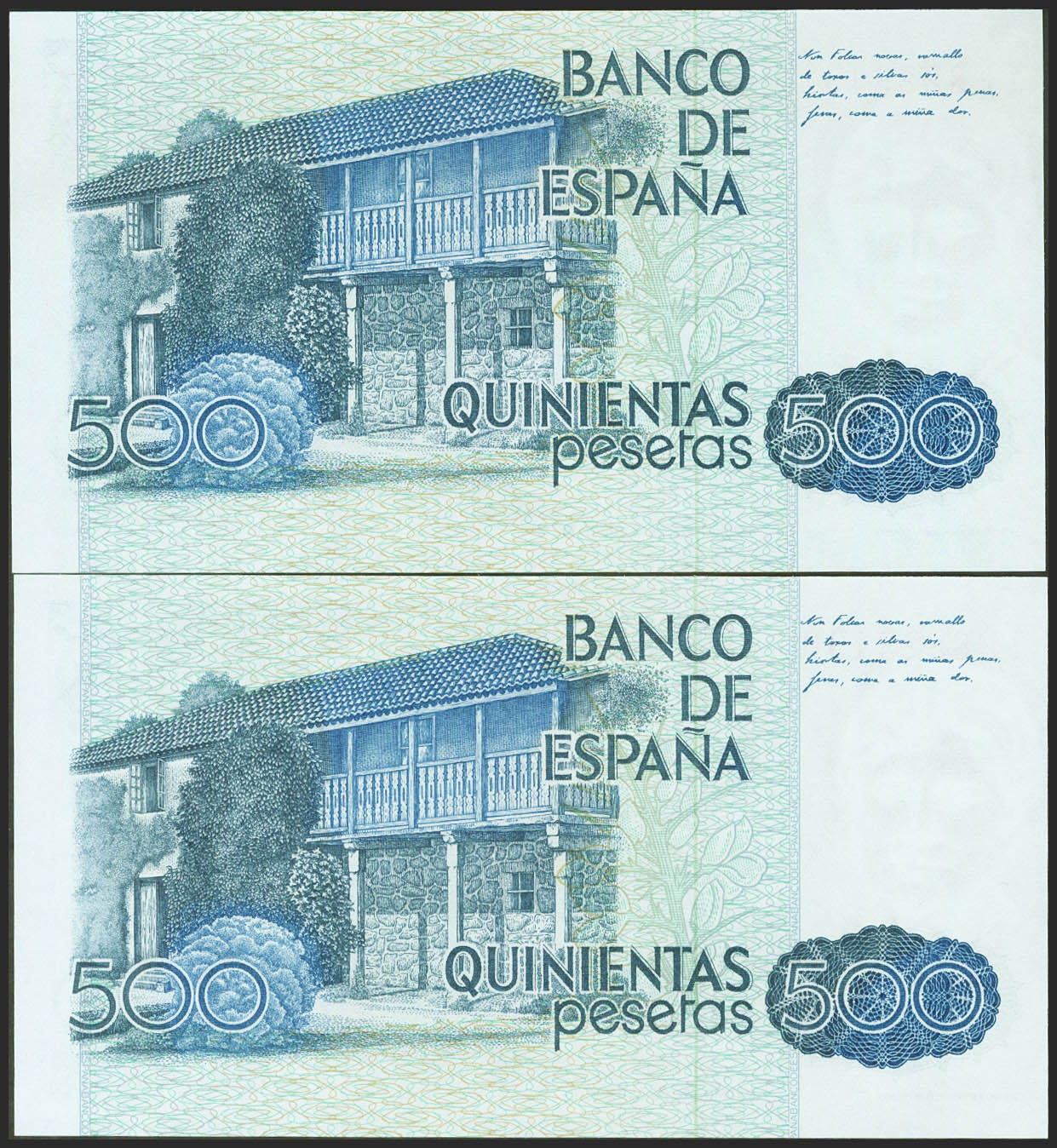500 Pesetas. October 23, 1979. Correlative couple. 1F series. (Edifil 2021: 476a). Uncirculated.