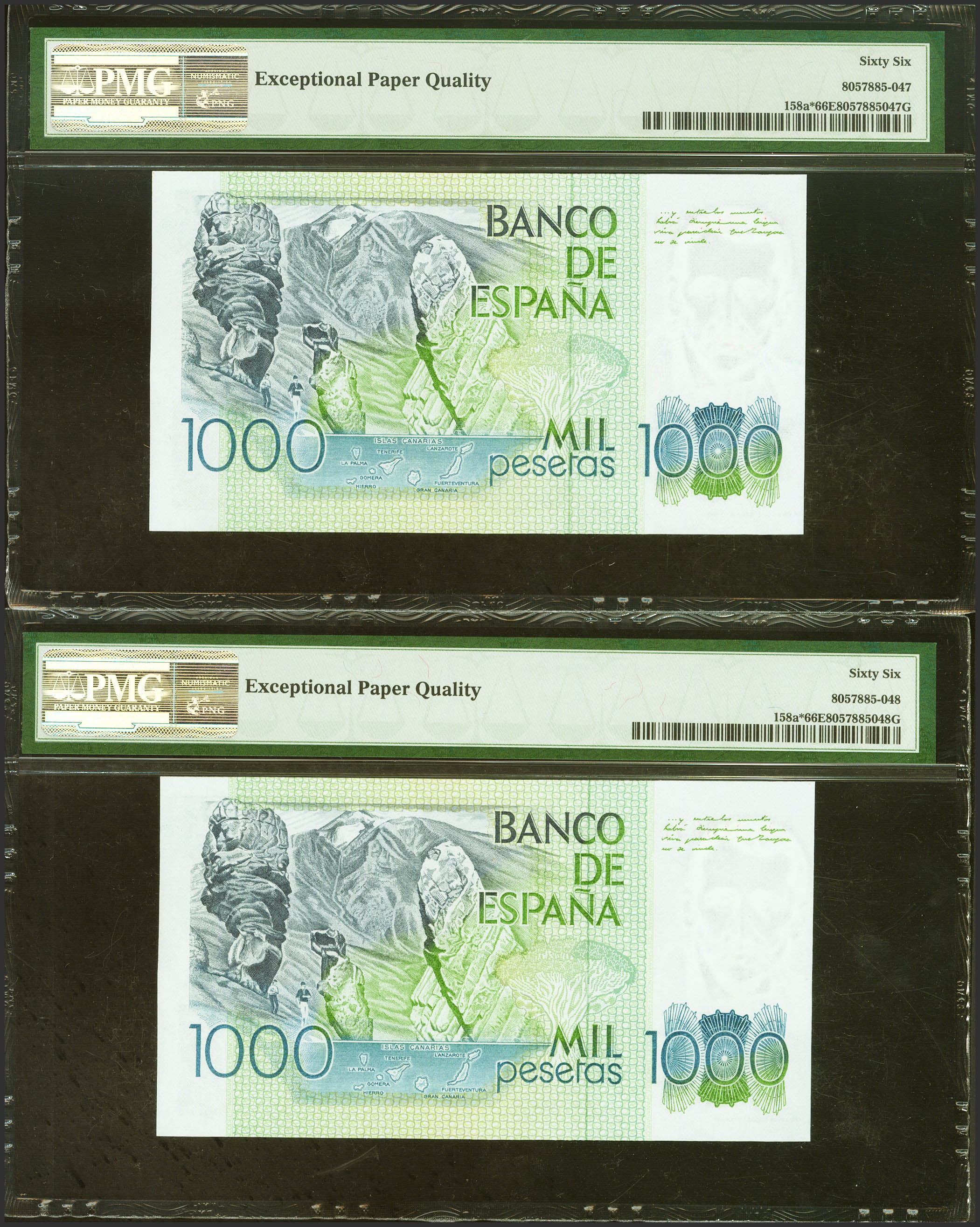 1000 Pesetas. October 23, 1979. Correlative couple. Special series 9A. (Edifil 2021: 477b, Pick: 158a*). Rare in this exceptional quality, original sizing. Uncirculated. PMG66EPQ package, both.
