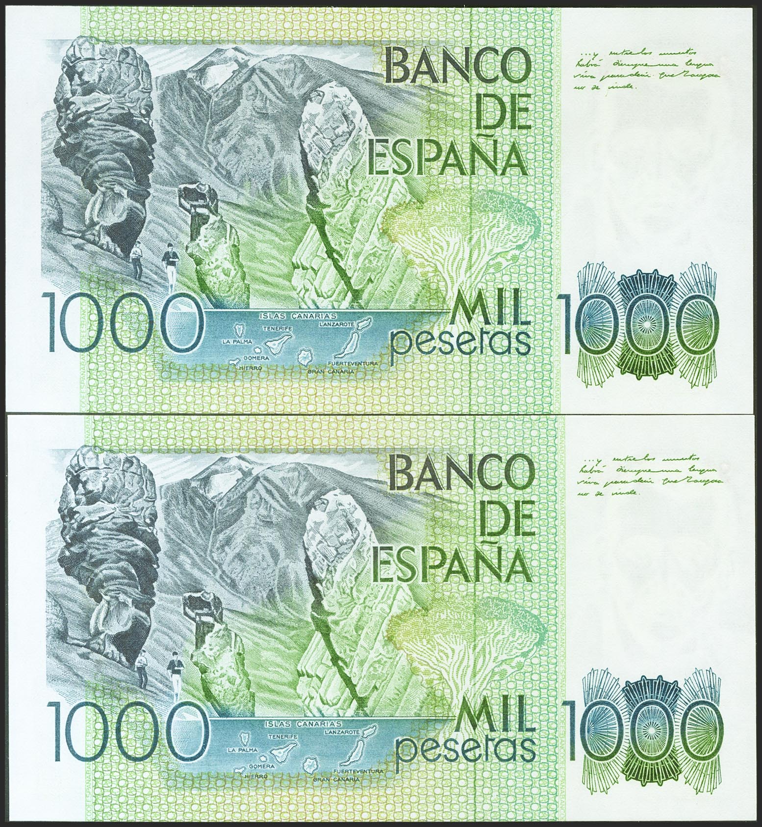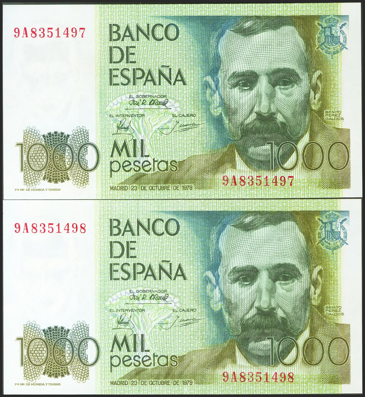 1000 Pesetas. October 23, 1979. Correlative couple. Special series 9A. (Edifil 2017: 477b). Unusual. Uncirculated.