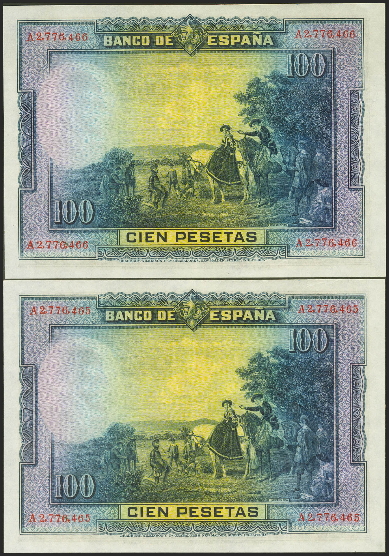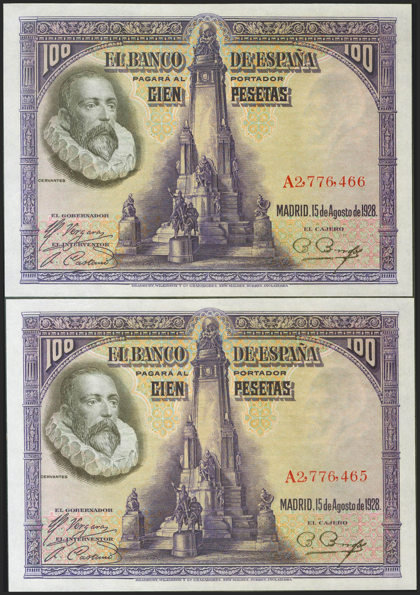 100 Pesetas. August 15, 1928. Correlative couple. Series A. (Edifil 2021: 355a). It retains much of the original finish. Good Extremely Fine.