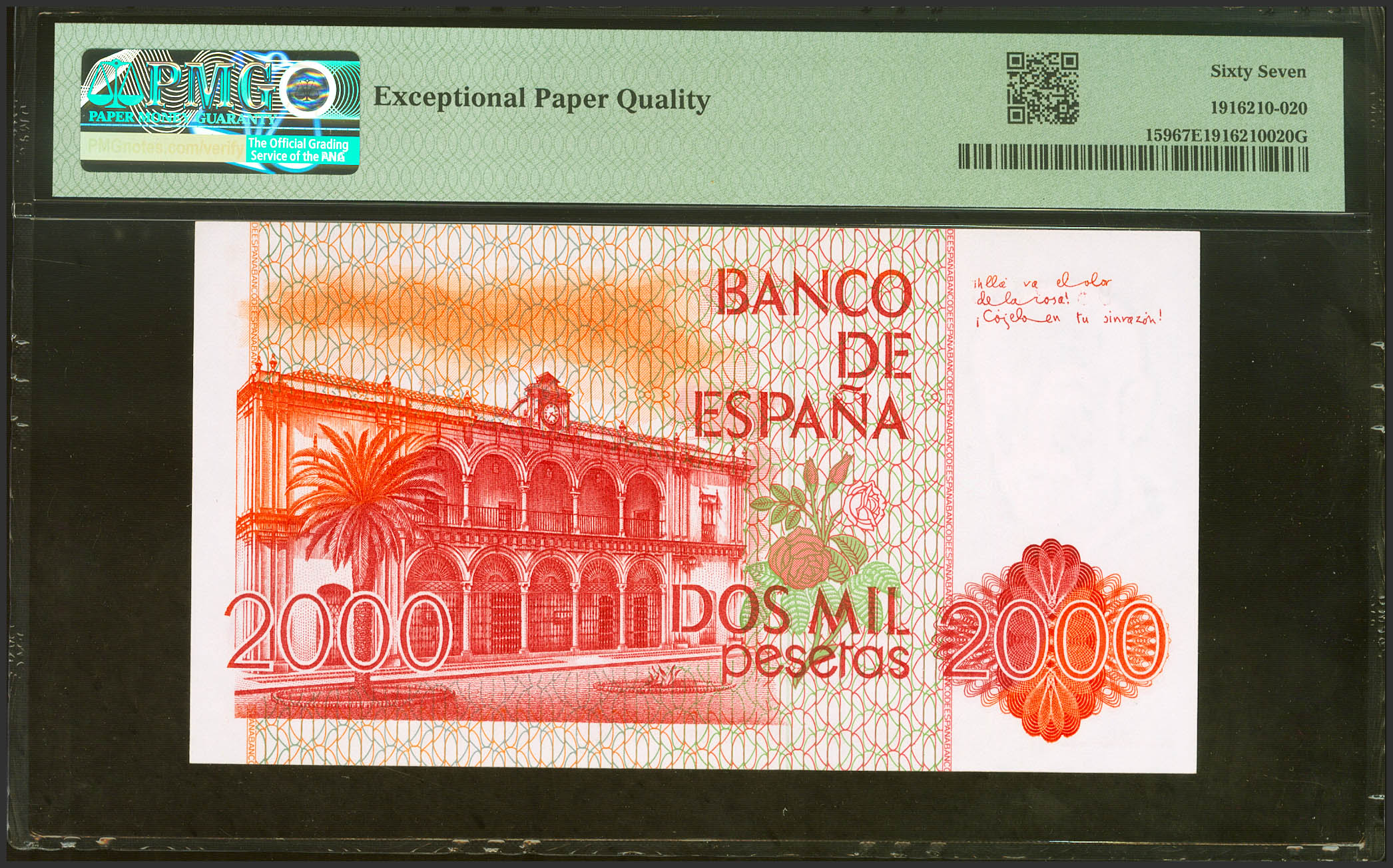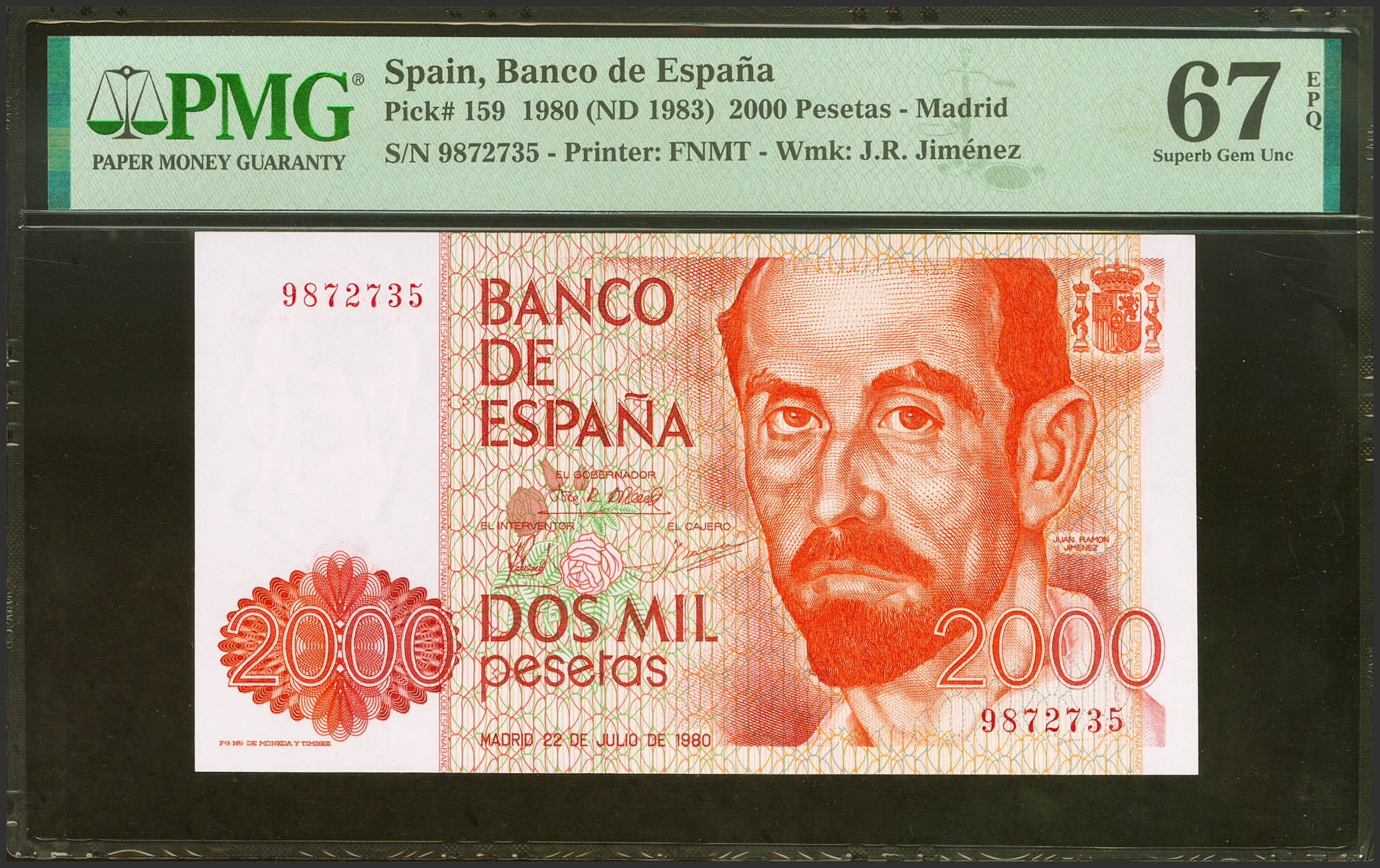 2000 Pesetas. July 22, 1980. No series. (Edifil 2023: 479, Pick: 159). Unusual in this exceptional quality. Uncirculated. PMG67EPQ package.