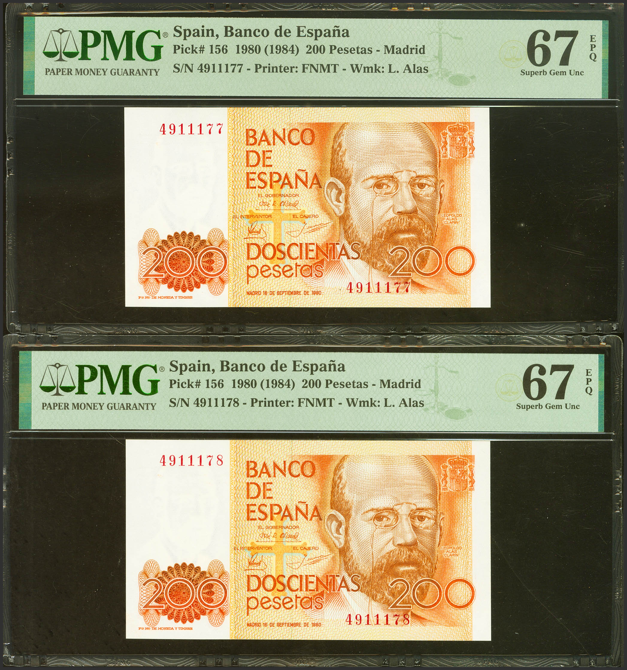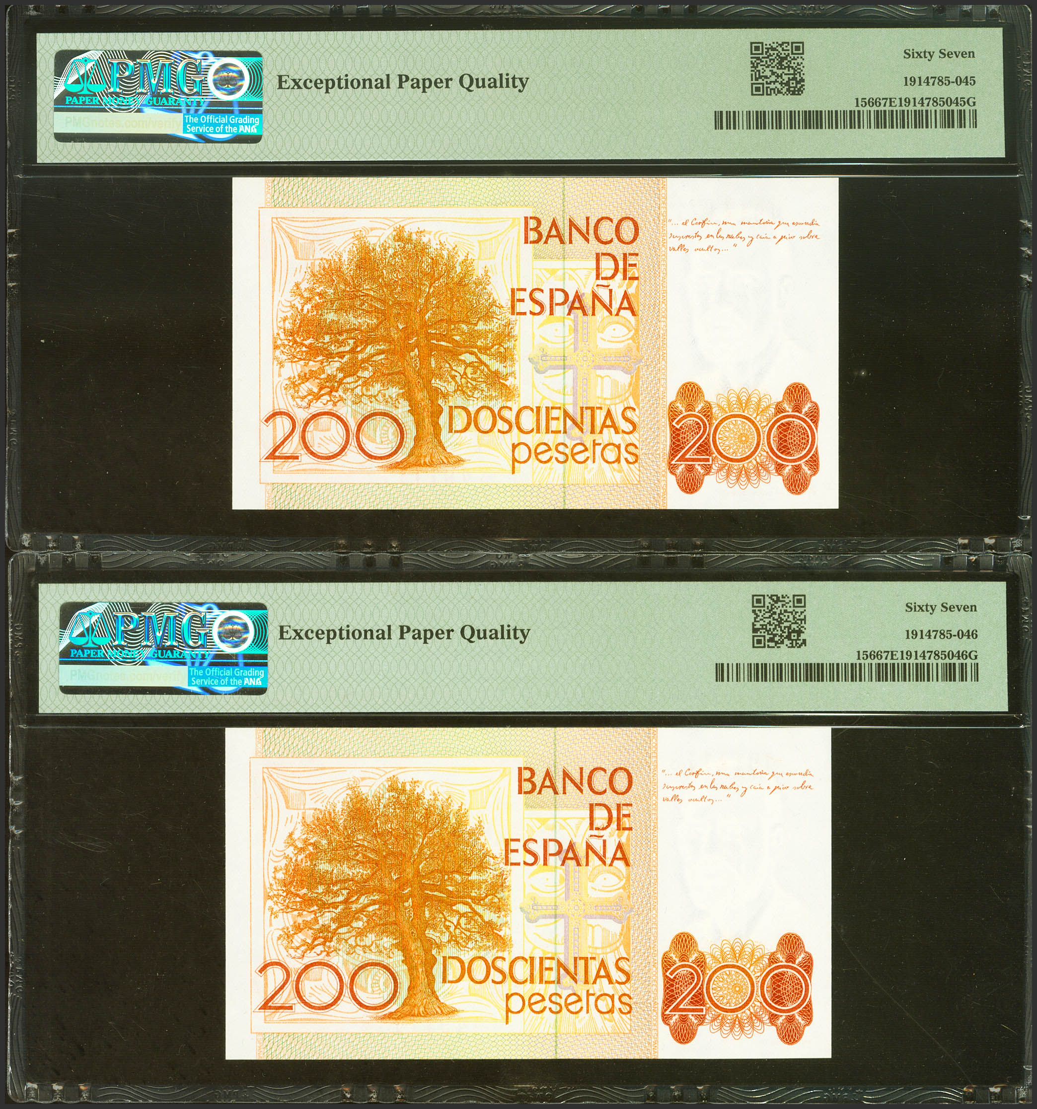 200 Pesetas. September 16, 1980. Correlative couple. No serie. (Edifil 2021: 480, Pick: 156). Unusual in this exceptional quality. Uncirculated. PMG67EPQ encapsulated, both.