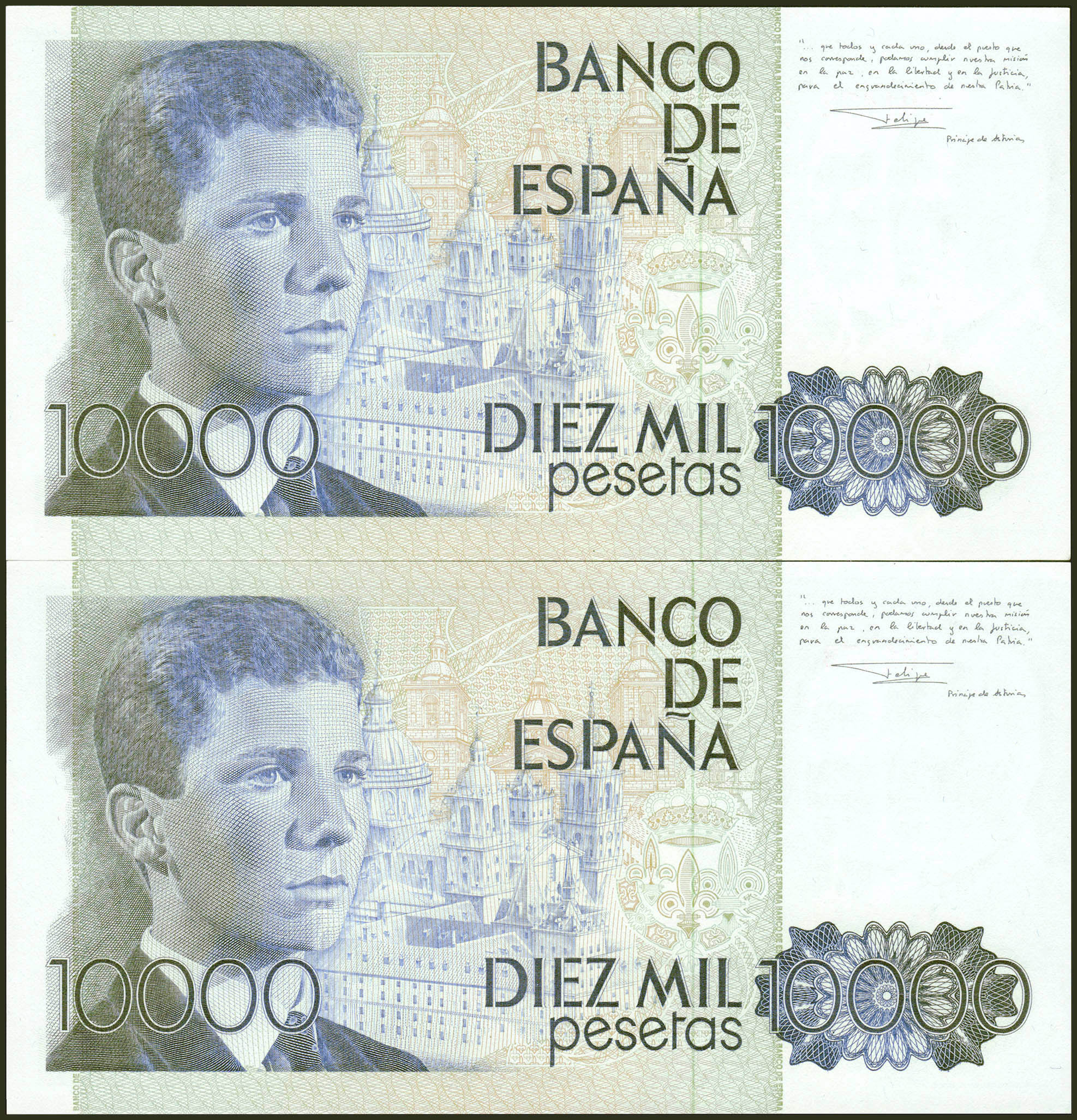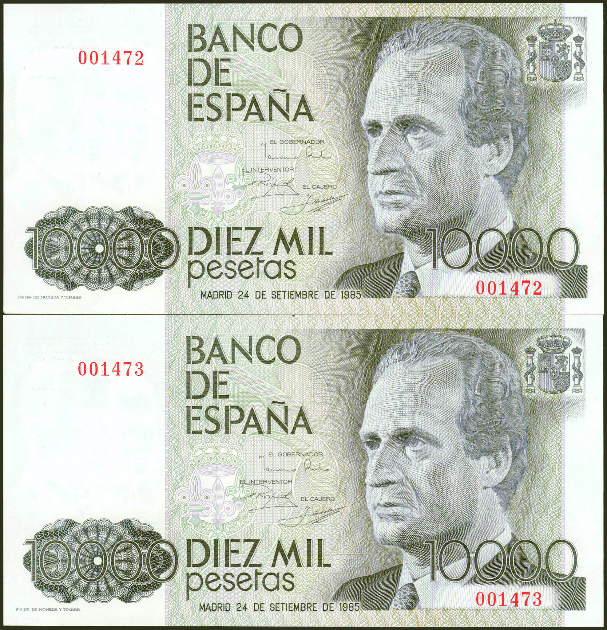 10,000 Pesetas. September 24, 1985. Correlative couple. No series and very low numbering. (Edifil 2021: 481). Almost Uncirculated.
