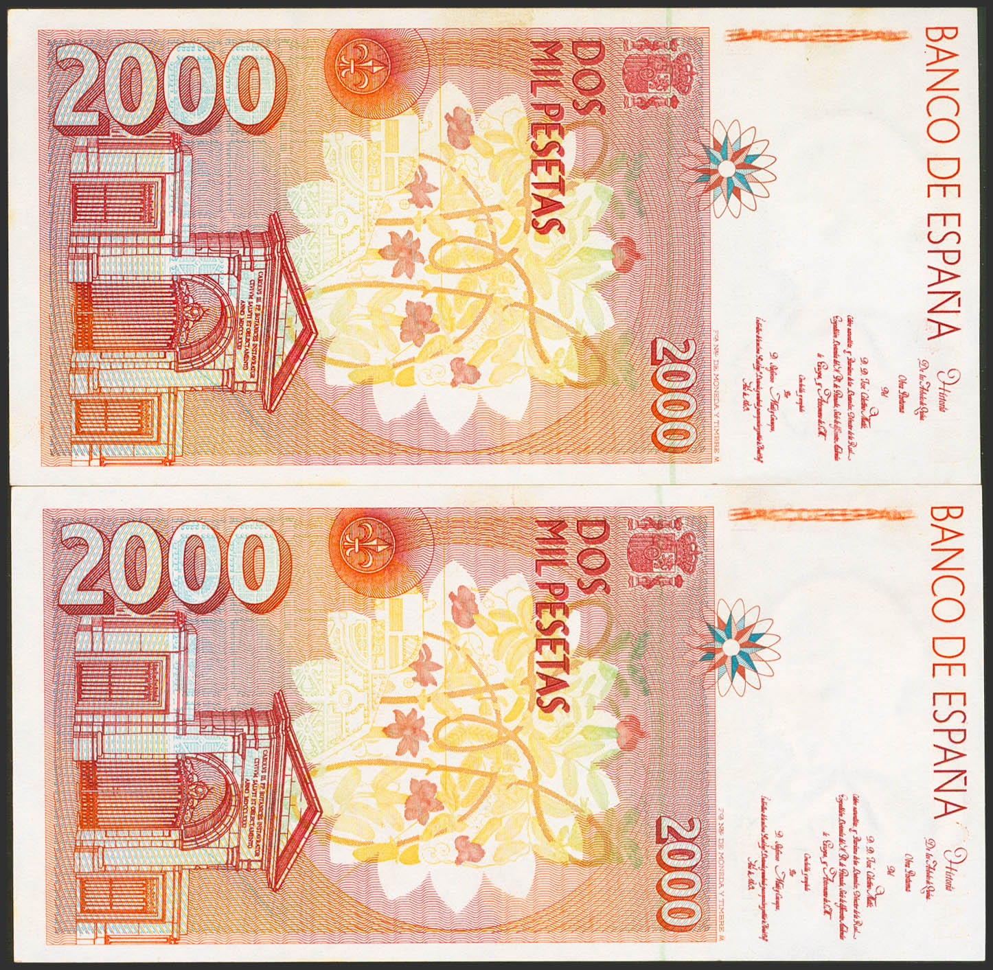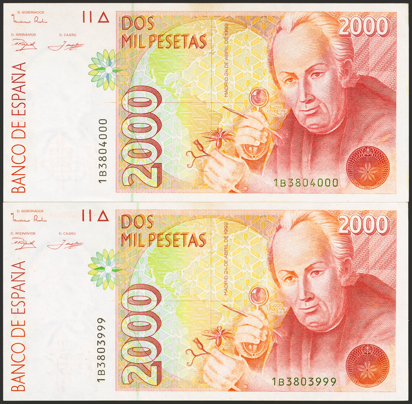 English 2000 Pesetas. April 24, 1992. Correlative couple. Series 1B. (Edifil 2023: 482a). Almost Uncirculated-.