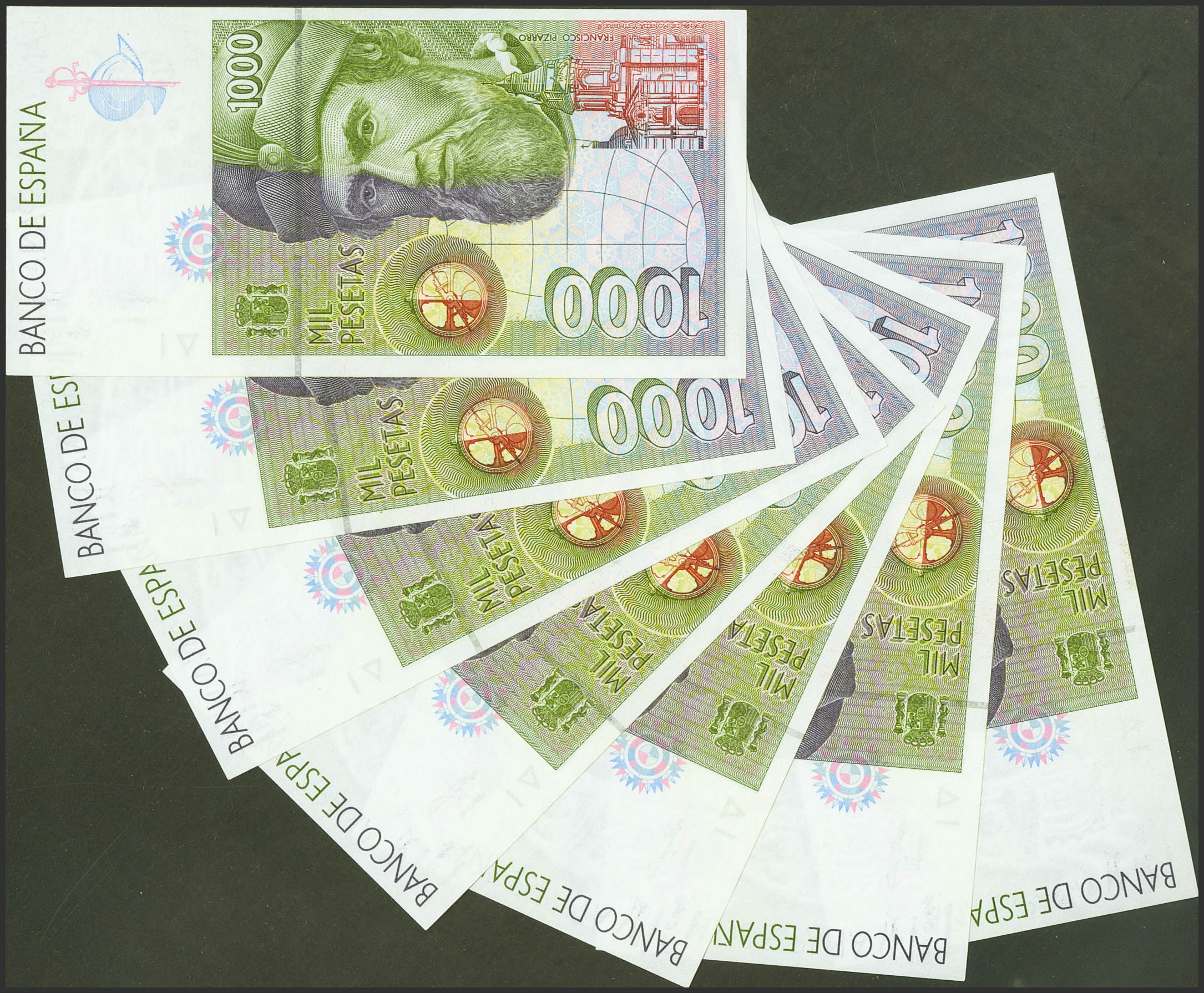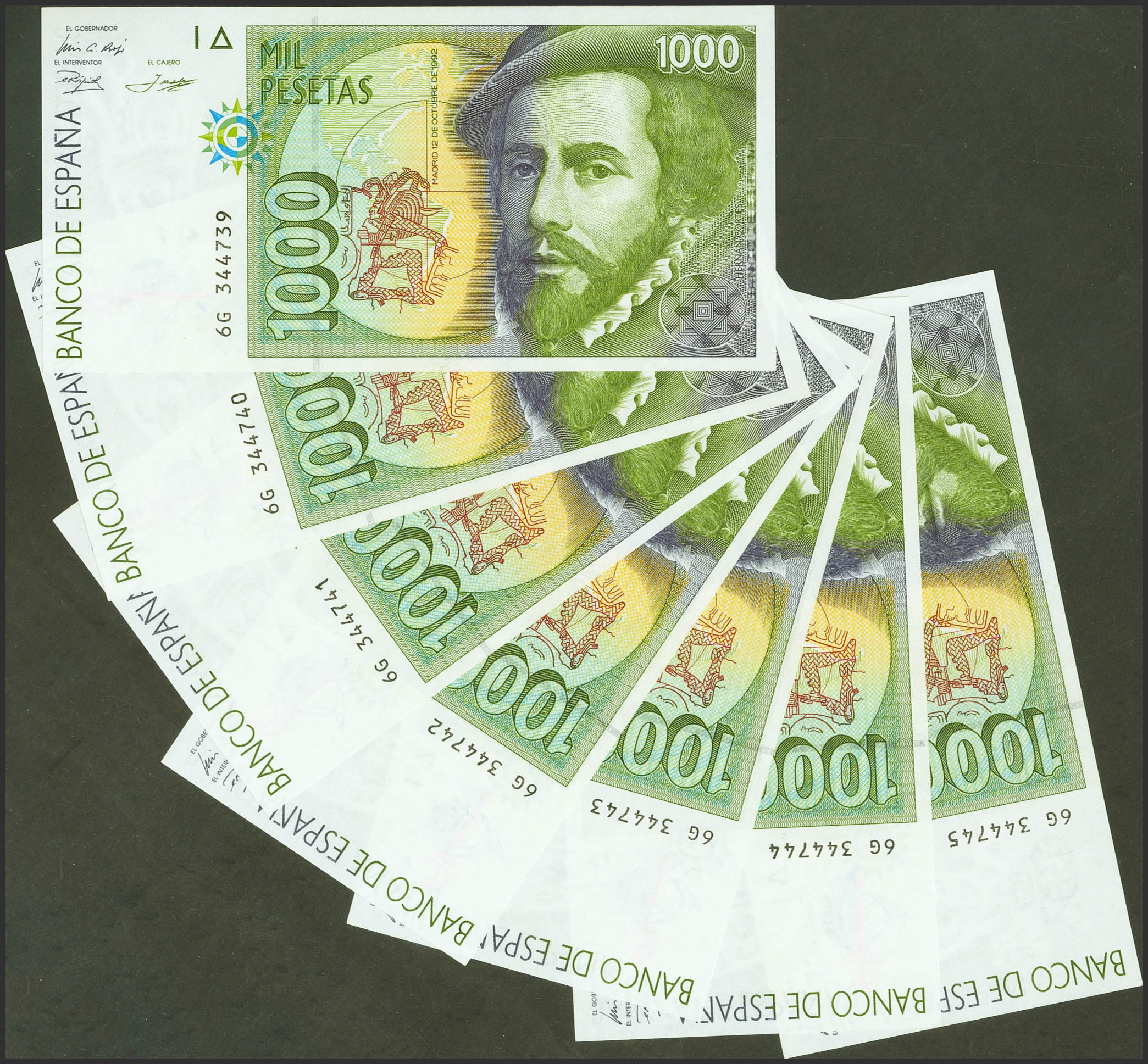 English Set of 7 consecutive 1000 Pesetas banknotes issued on October 12, 1992, all with the 6G series. (Edifil 2023: 483b). Uncirculated.