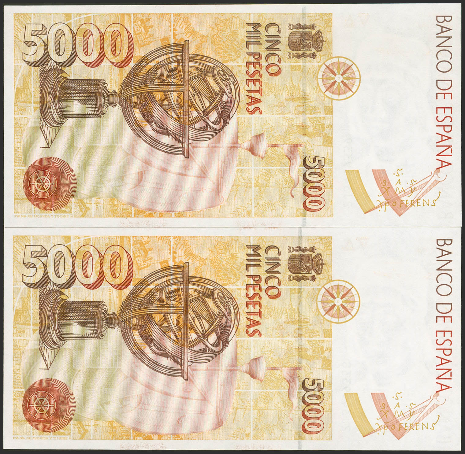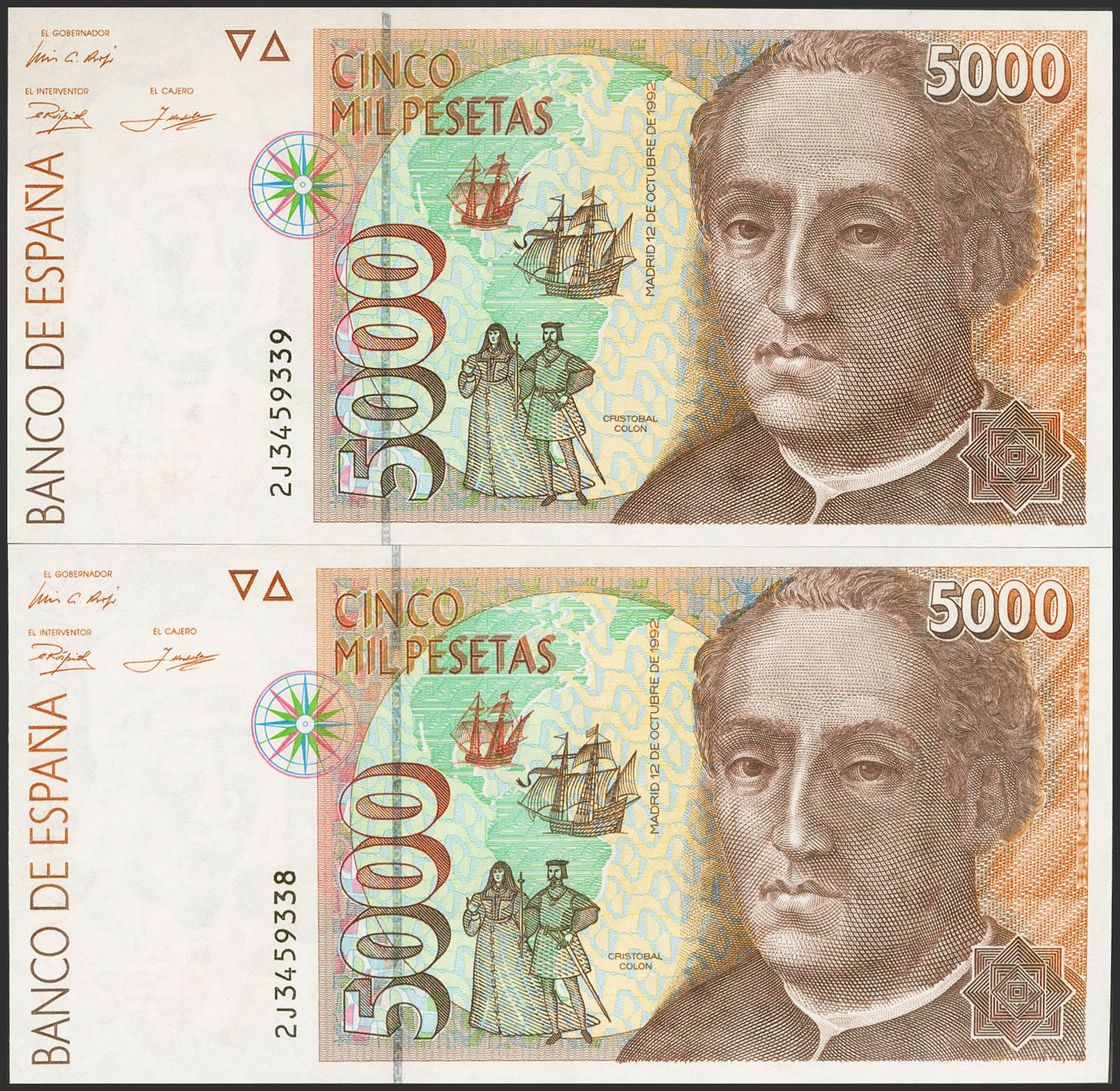 5000 Pesetas. October 12, 1992. Correlative couple. 2J series. (Edifil 2023: 484a). Uncirculated.