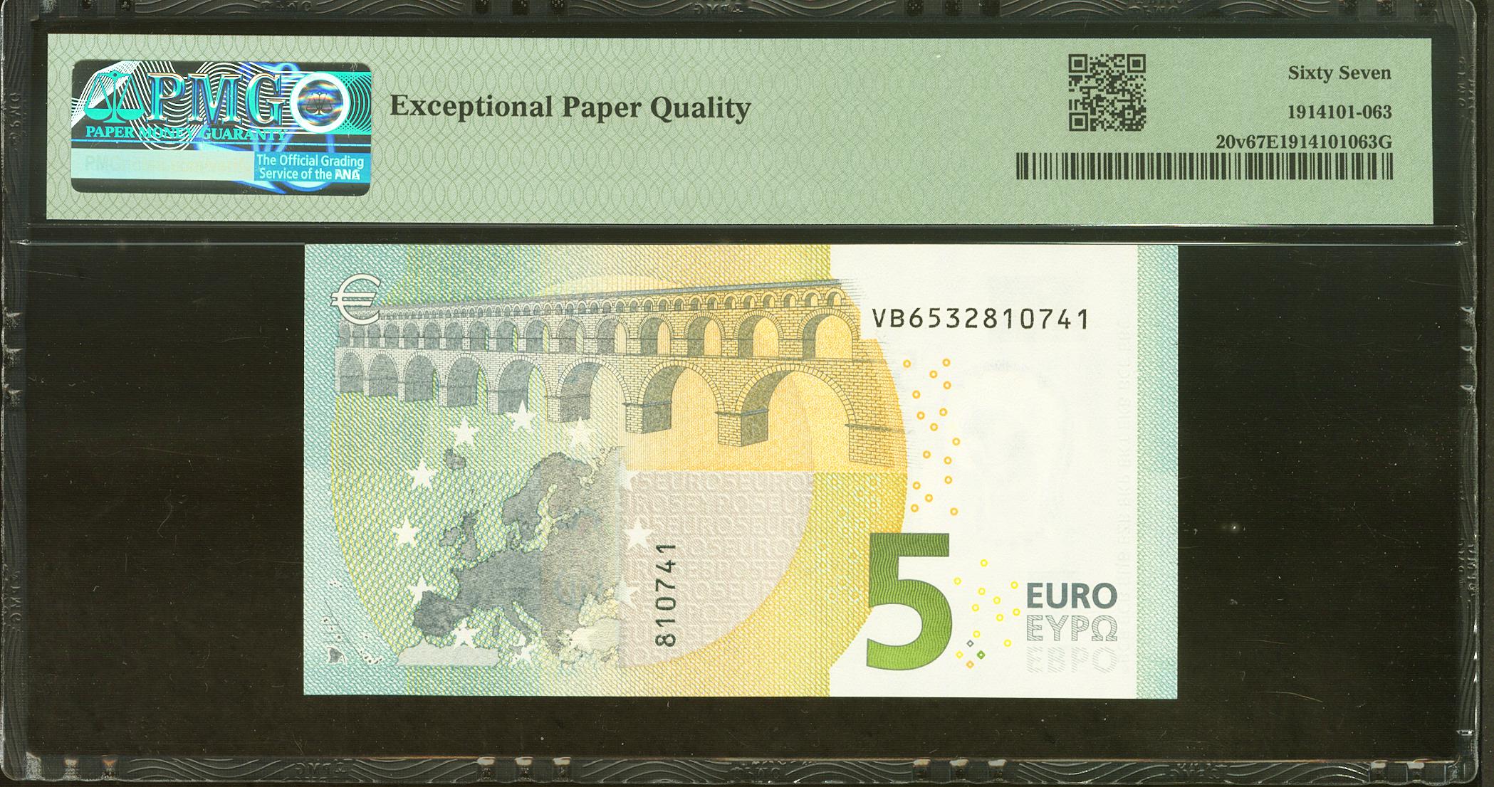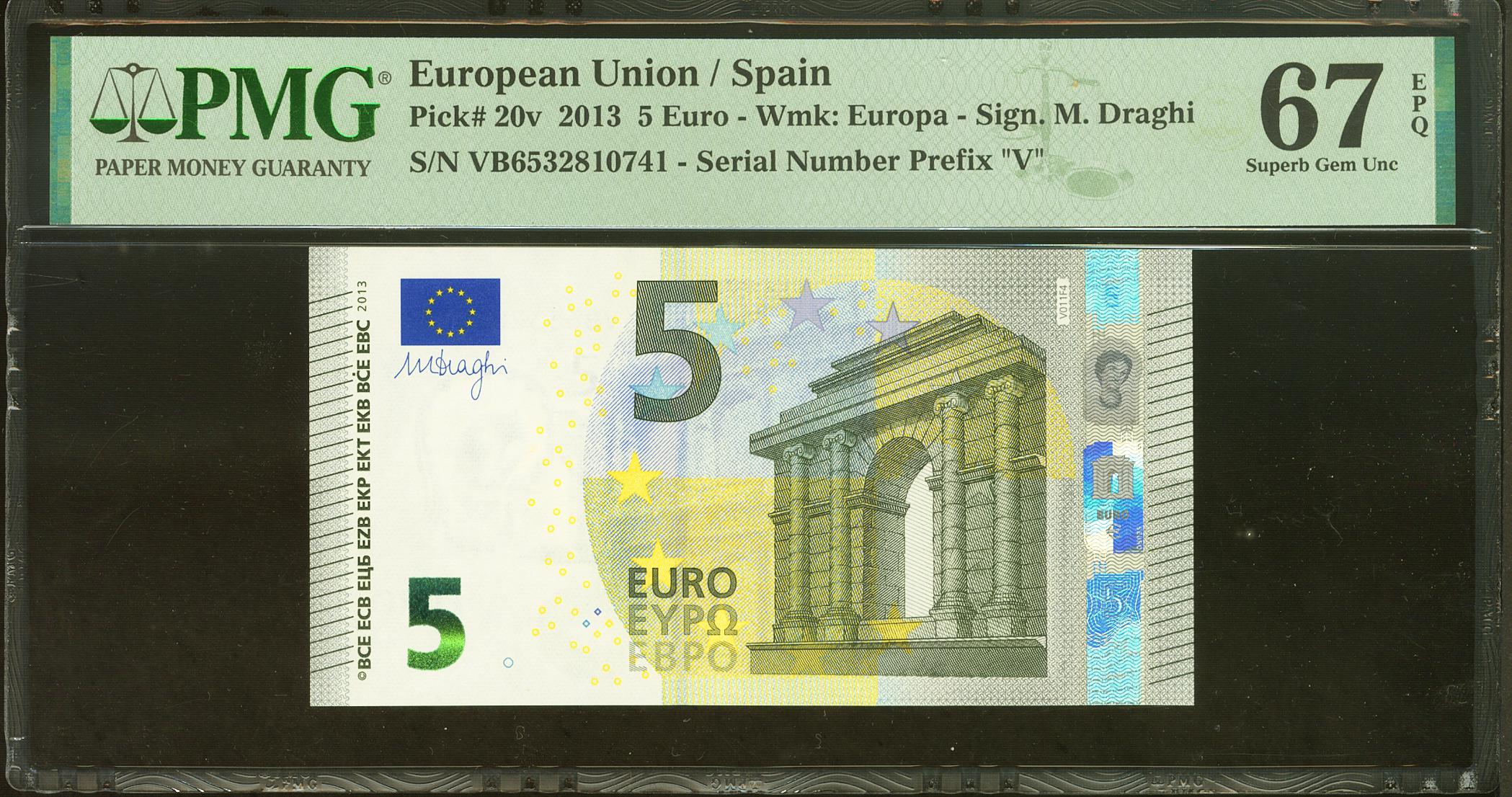 5 euros. May 2, 2013. Draghi signature. Series V (Spain). (Edifil 2021: 493, Pick: 20v). Uncirculated. PMG67EPQ package.