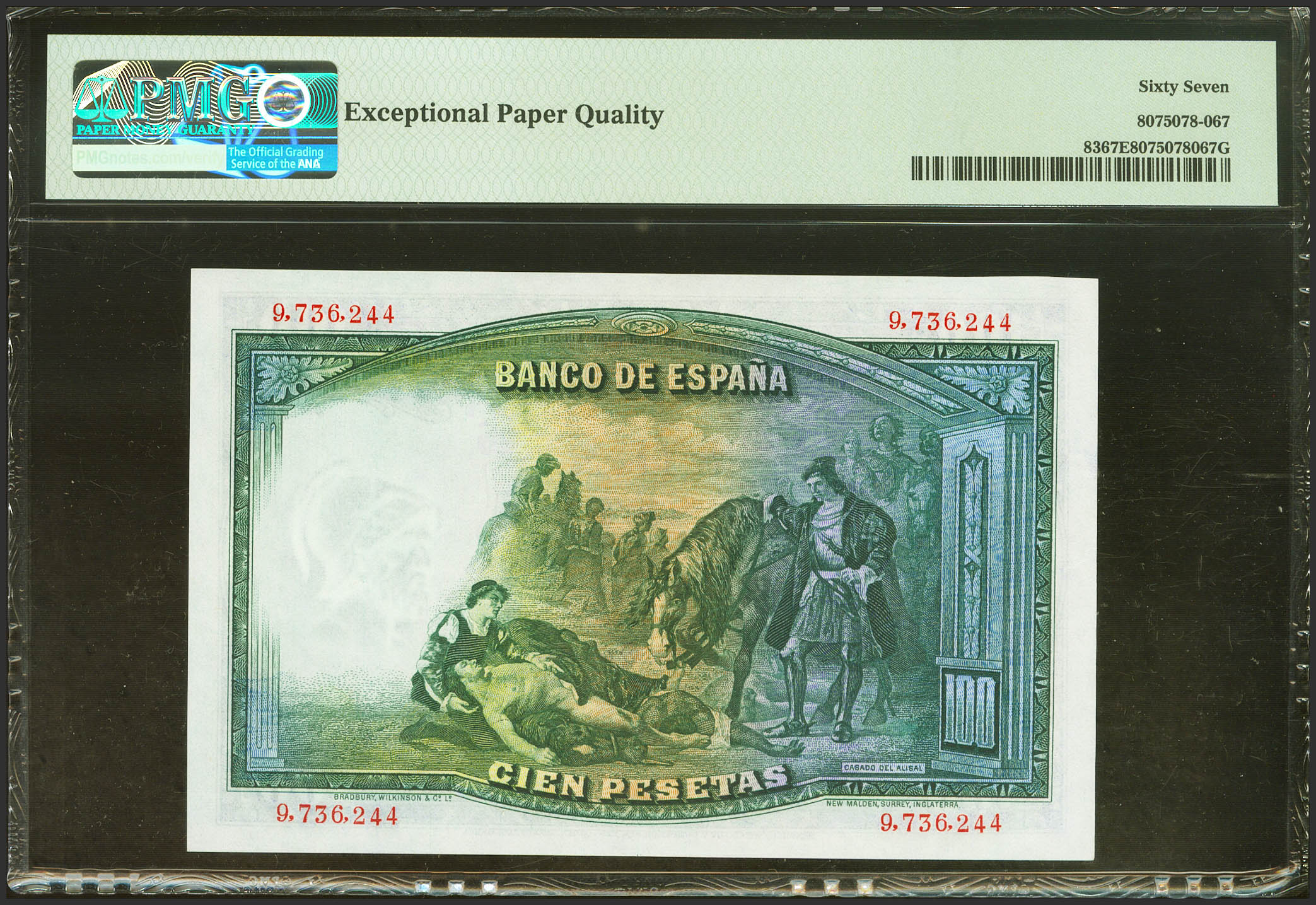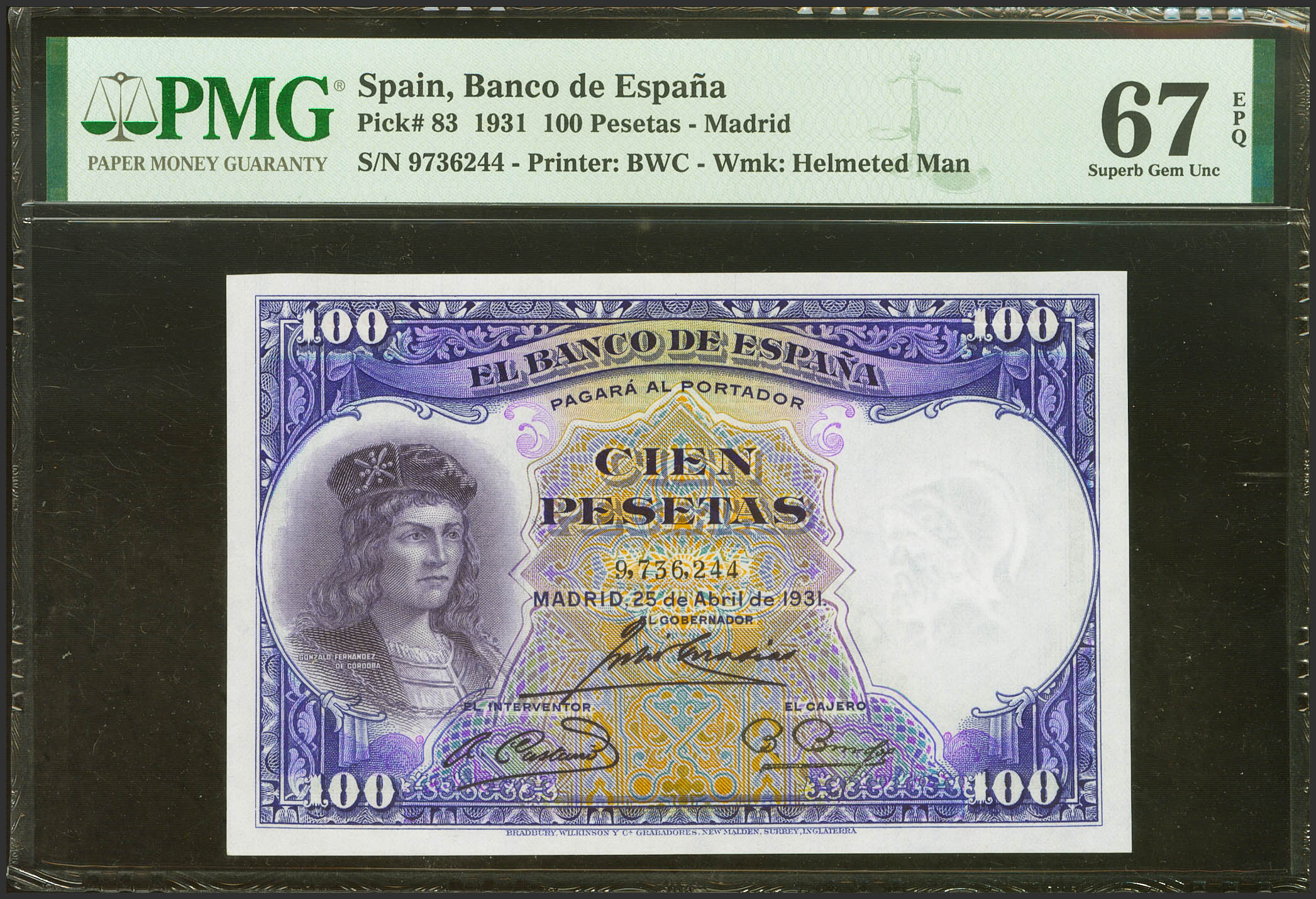 100 Pesetas. April 25, 1931. No series. (Edifil 2023: 360, Pick: 83). Rare in this exceptional quality, original sizing. Uncirculated. PMG67EPQ package.