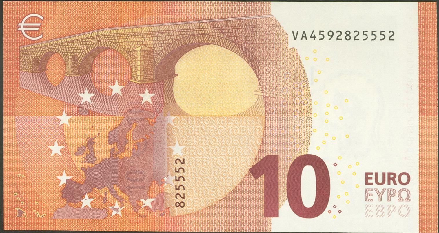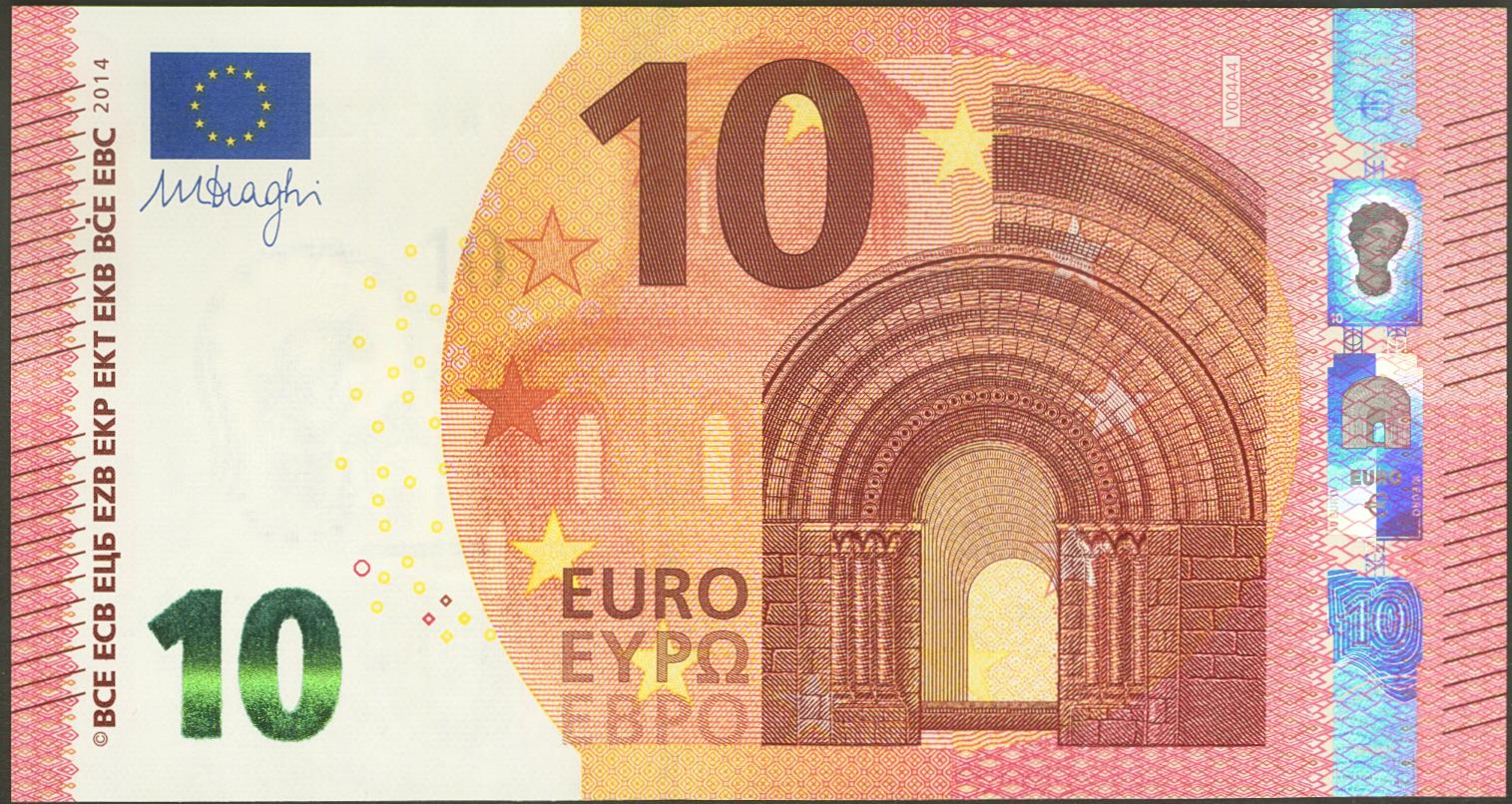 10 euros. September 23, 2014. Signature Draghi. Series V (Spain). (Edifil 2021: 494). Natural waviness from the manufacturing process (this is the only reason for "removing" the Uncirculated). EBC+++.