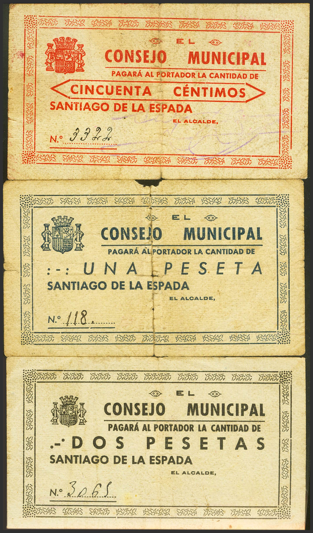 SANTIAGO DE LA ESPADA (JAEN). 50 Centimos, 1 Peseta and 2 Pesetas. (1937ca). (González: 4754, 4755, 4756). Very rare. Very Fine/ Almost Very Fine.