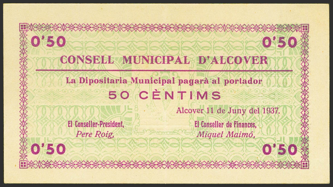 English ALCOVER (TARRAGONA). 50 Cents. June 11, 1937. Series B. (González: 6146). Rare, reverse reverse. Almost Extremely Fine.