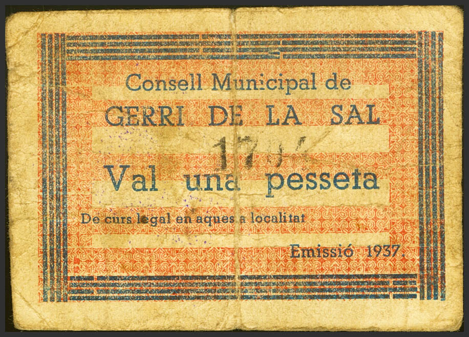 GERRI DE LA SAL (LERIDA). 1 Peseta. (1937ca). (González: 8019). Rare. Almost Very Fine.