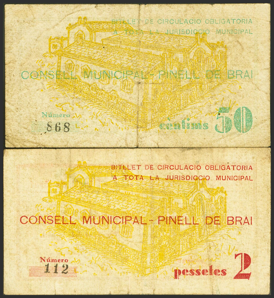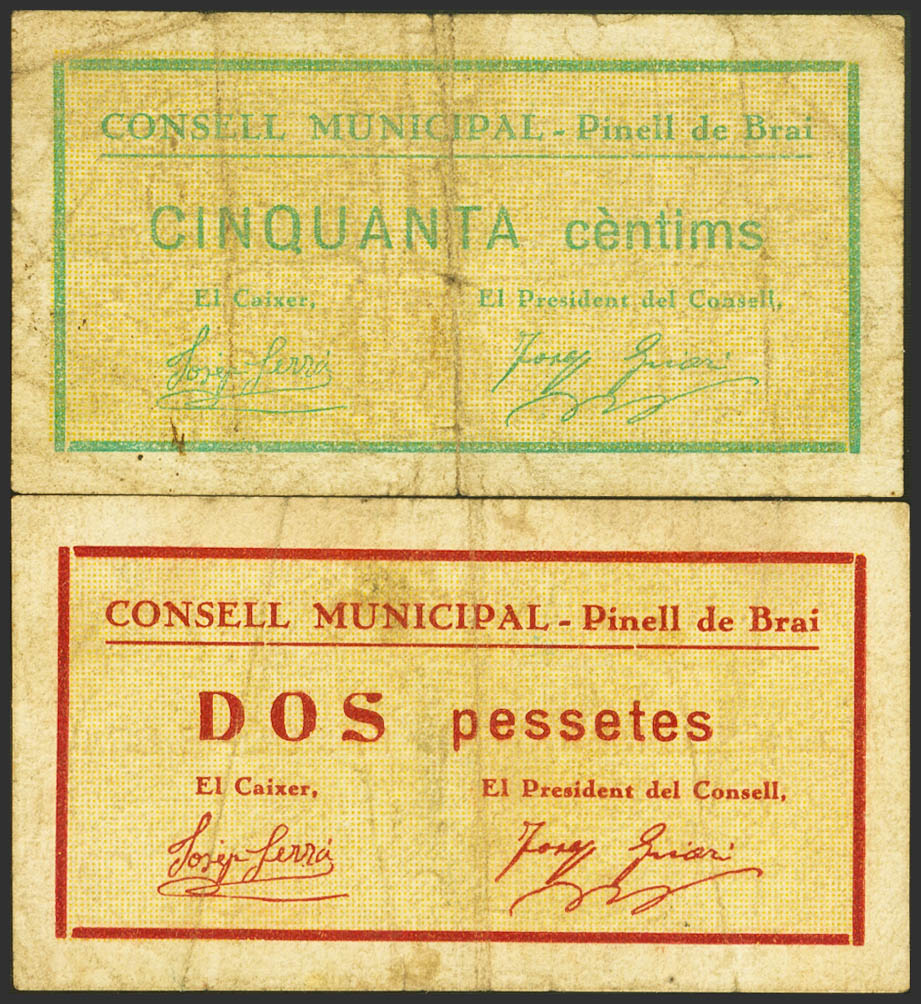 PINELL DE BRAI (TARRAGONA). 25 Cents and 2 Pesetas. (1937ca). (González: 9238, 9241). Very rare. Very Fine.