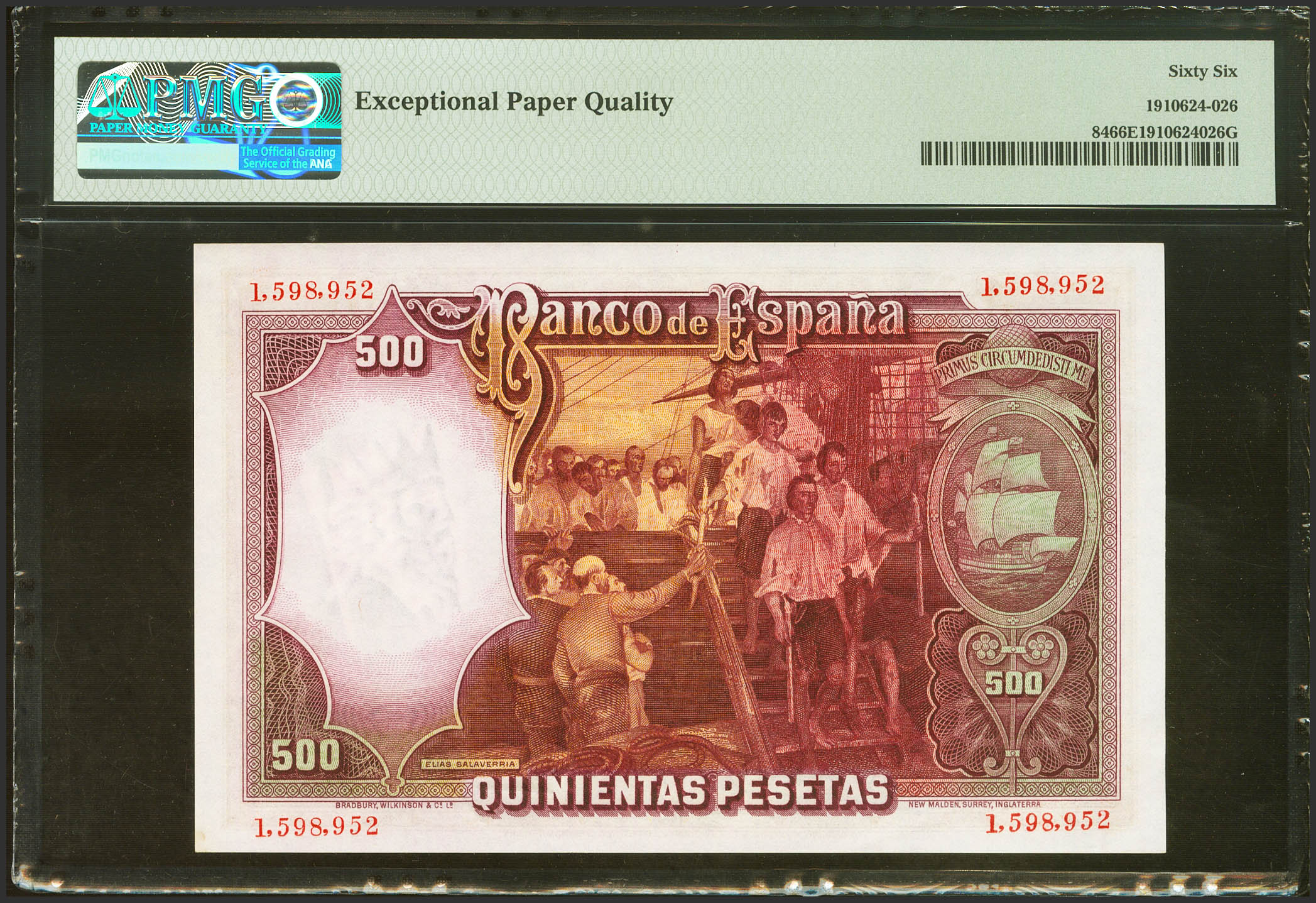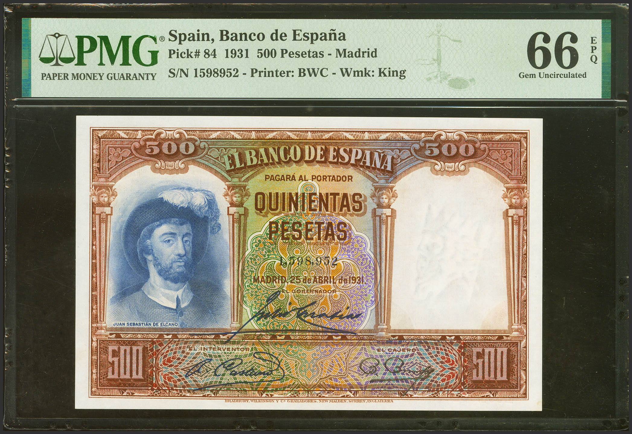 500 Pesetas. April 25, 1931. No series. (Edifil 2023: 361, Pick: 84). Unusual in this quality, original sizing. Uncirculated. PMG66EPQ package.