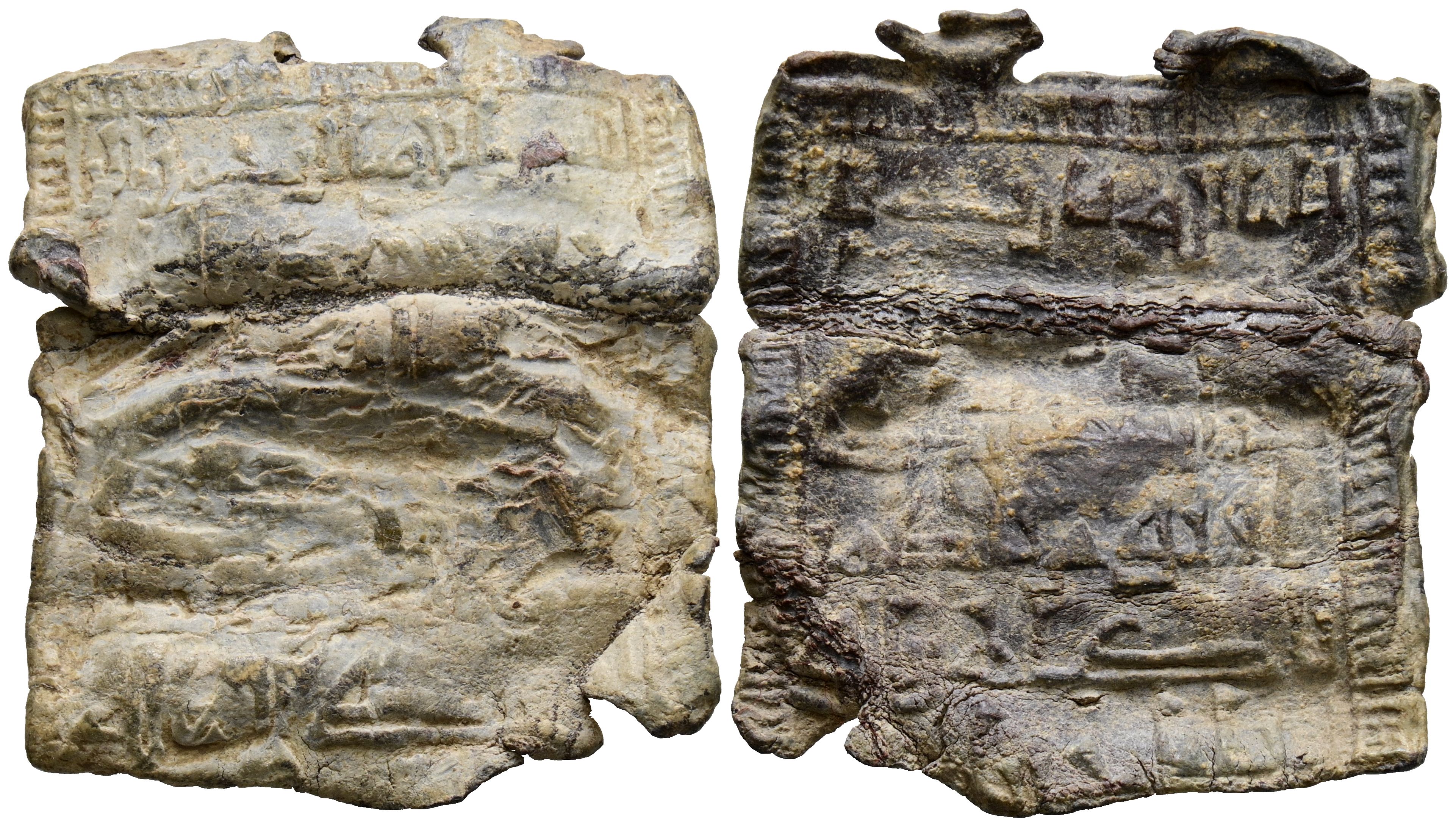 CALIFAL PERIOD. Rectangular amulet. (Pb. 6.35g/28x25mm). Possibly 10th century. Rectangular lead plate with signs of having been folded in the form of a diptych and remains of two fastening rings at the top. It presents linear Kufic writing, with straight strokes, with the ends of the tall letters finished with a bevel and swan neck endings. The Quranic text is divided into seven rather diffuse lines in Anv: .....بسم ألله الر / حمن الرحيم. And six on the back that are difficult to read. (Amulets 69-D3. Type A-IV, same specimen). Very Fine.